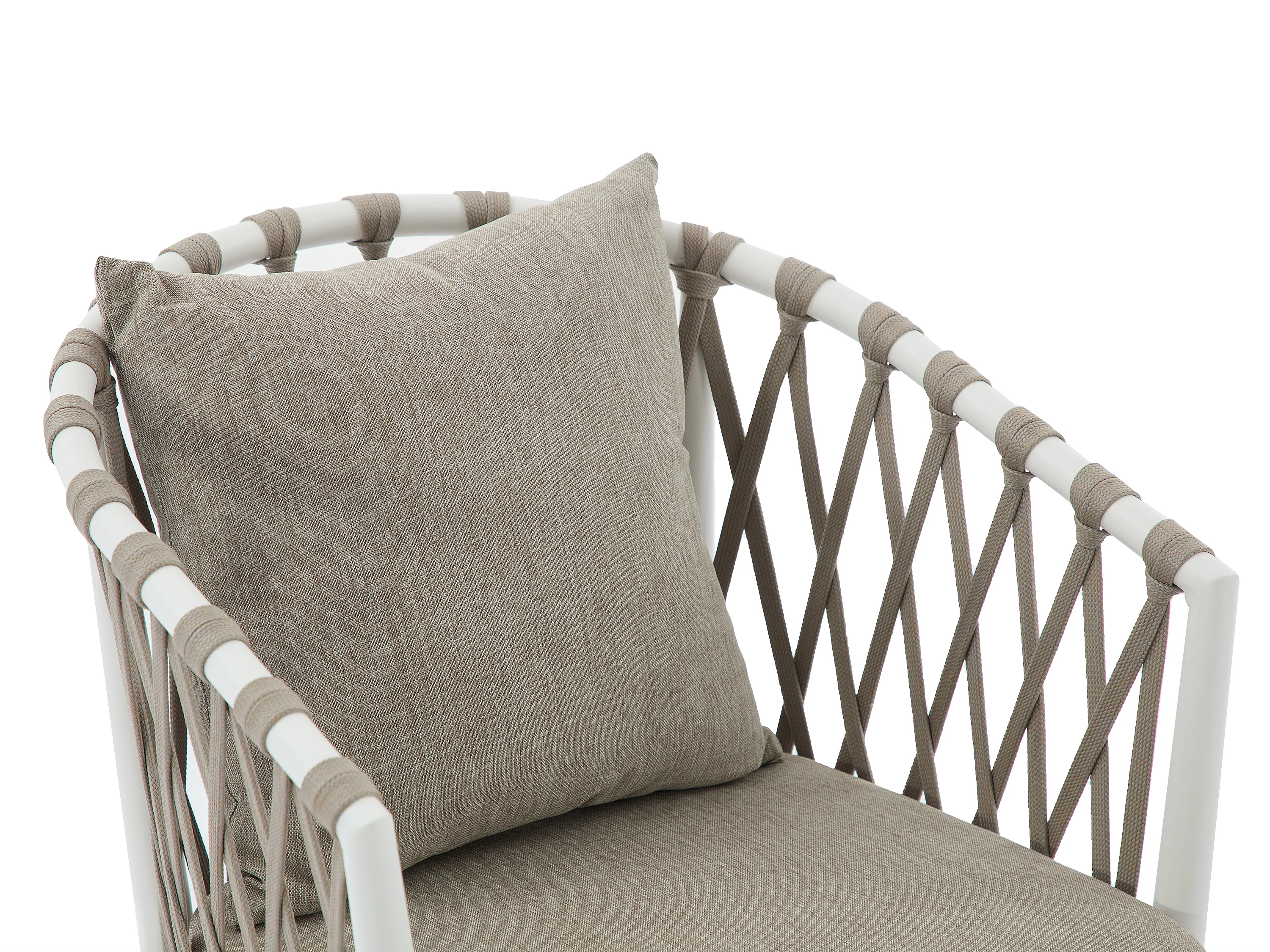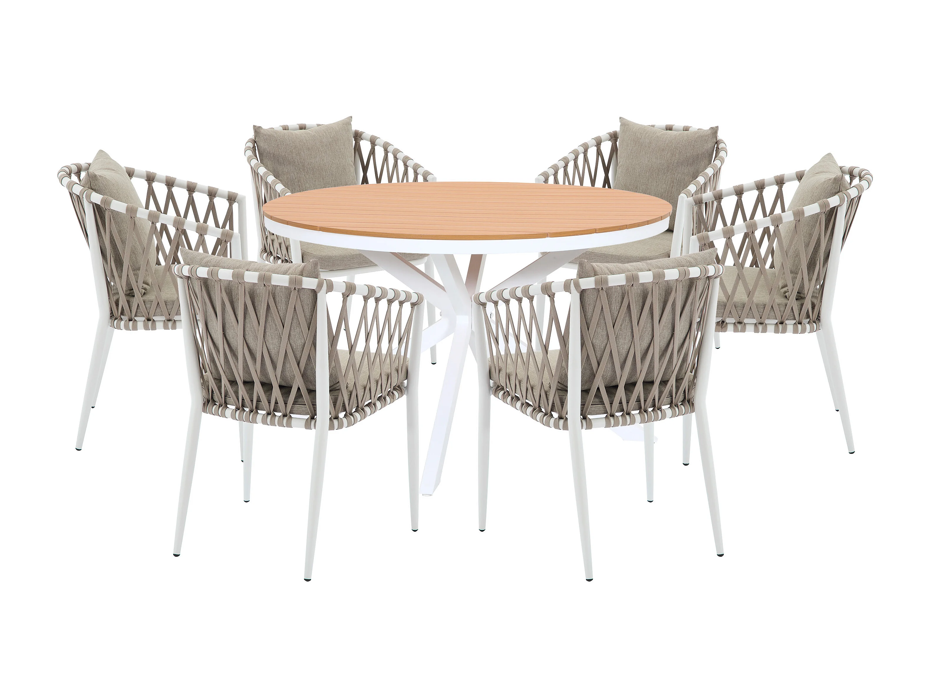 Salle à manger de jardin en aluminium et corde tressée : la table ronde D.125 cm et 6 fauteuils - Naturel clair et blanc - MISSO de MYLIA