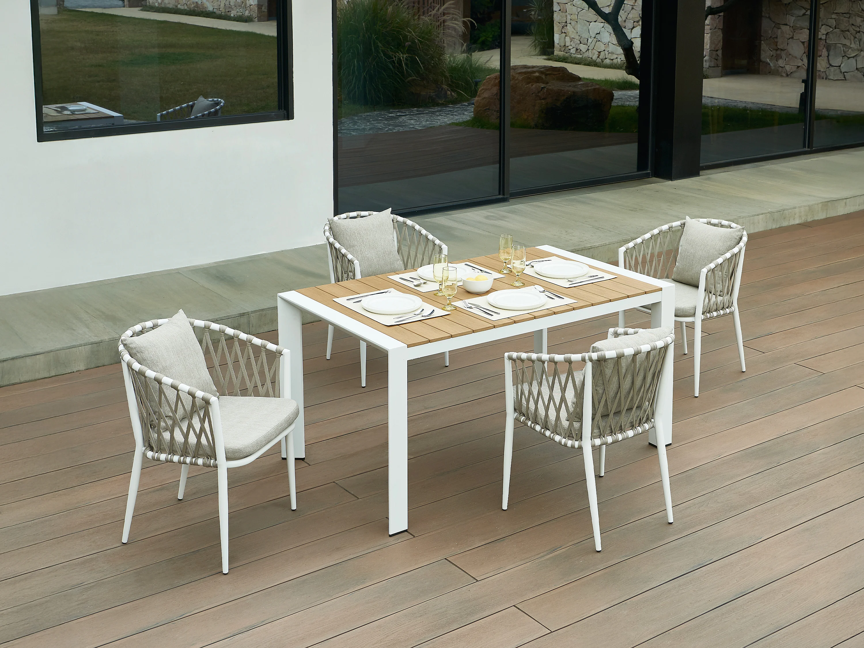 Salle à manger de jardin en aluminium et corde tressée : une table L.150 cm et 4 fauteuils - Naturel clair et blanc - MISSO de MYLIA
