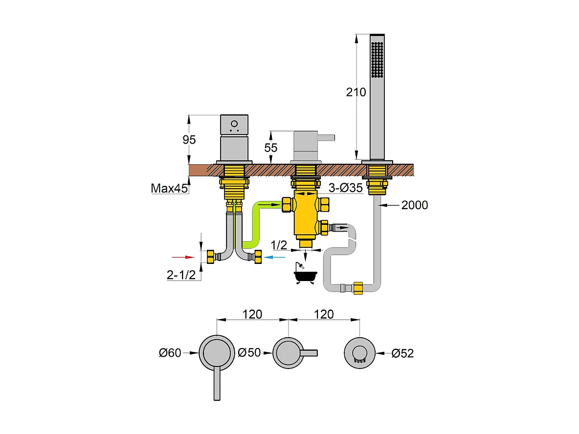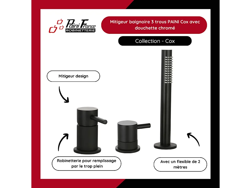 Mitigeur baignoire mécanique 3 trous PAINI Cox pour remplissage par le vidage avec douchette Noir mat