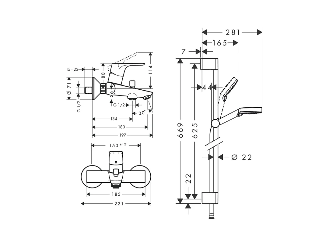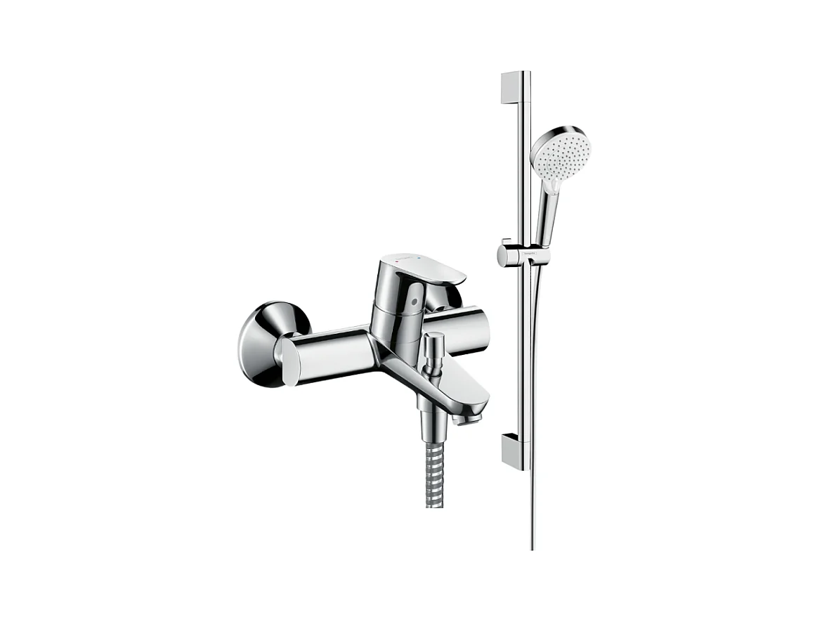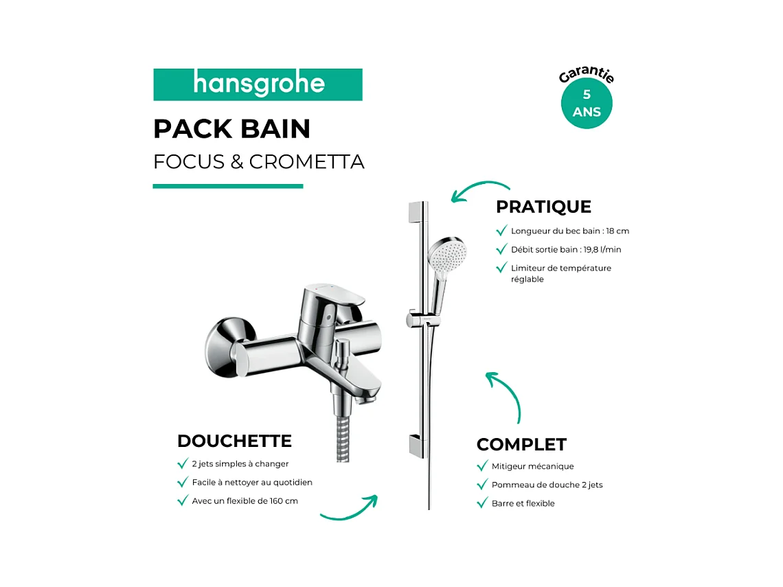 Mitigeur baignoire mécanique HANSGROHE Focus chromé + pack pommeau de douche Crometta 2 jets + flexible + barre