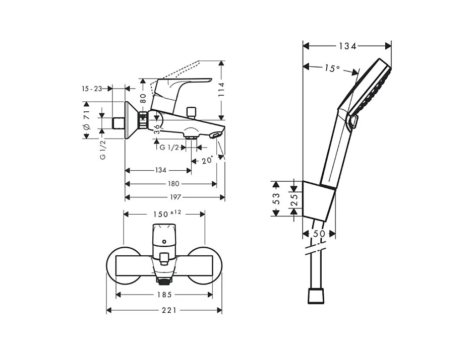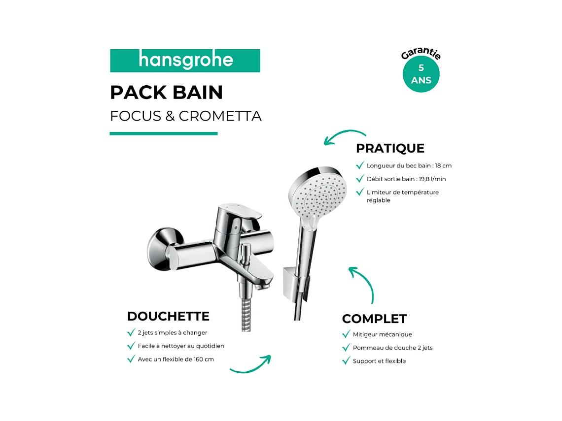 Mitigeur baignoire mécanique HANSGROHE Focus chromé + pack pommeau de douche Crometta 2 jets + support + flexible