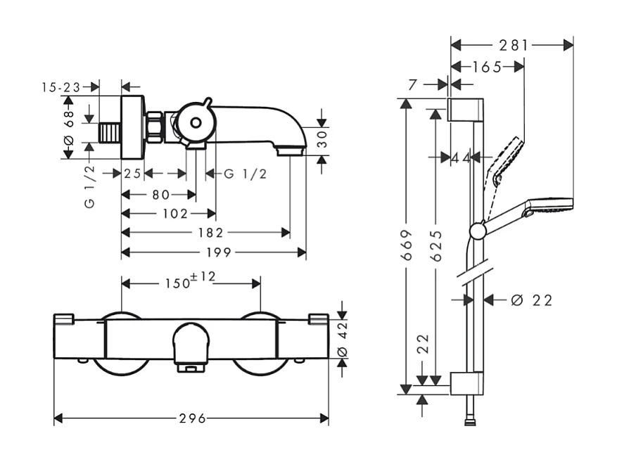 Mitigeur baignoire thermostatique HANSGROHE Ecostat 1001 CL chromé + pack pommeau de douche Crometta 2 jets + flexible + barre