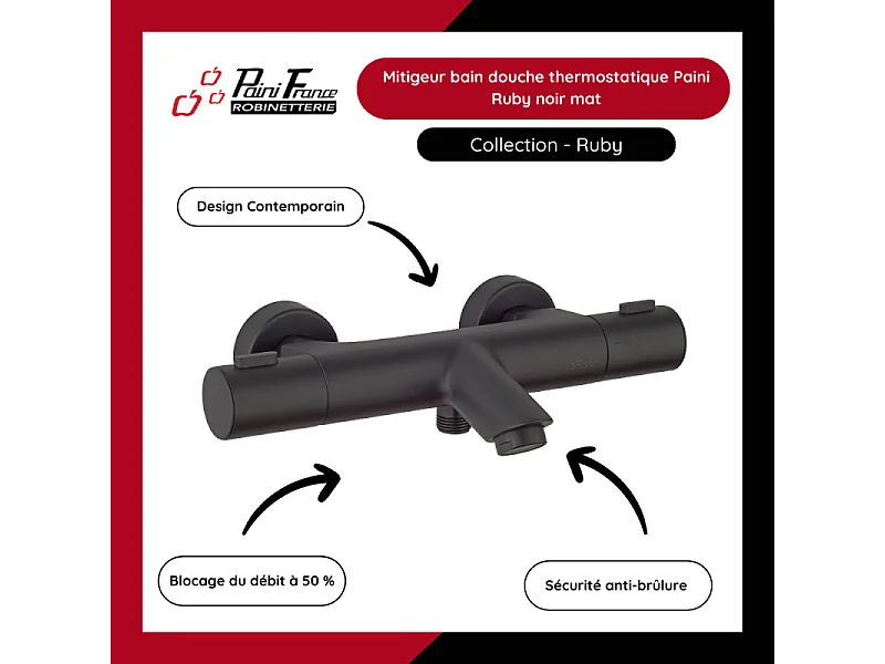 Mitigeur bain douche thermostatique PAINI Ruby + Minikit douchette 3 jets rond Ruby + Colonnettes Noir mat