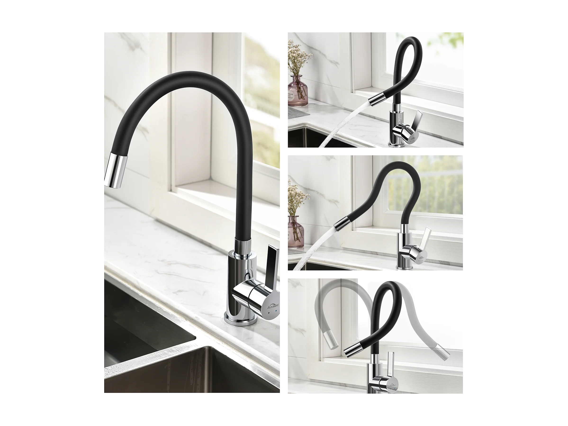 Mitigeur Cuisine Auralum MAX Noir Flexible Bec Haut Orientable Librement Robinet Évier Laiton Mémoire Forme Robinet Evier Monotrou Eau Chaude/ Froide