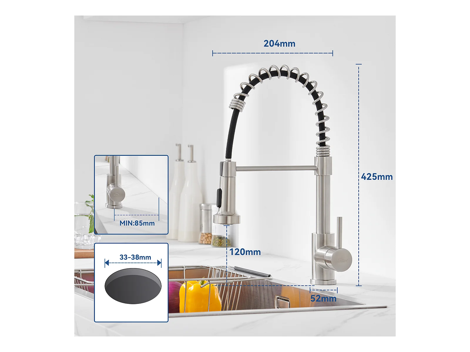 AuraLum Max Mitigeur Cuisine à Ressort Spiralé avec 2 Fonctions Douchette Robinet d'évier Rotatif 360° en Inox 304 pour Cuisine, Brossé,EU Modèle