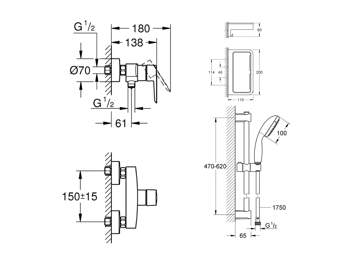 Mitigeur douche mécanique GROHE start Black + Ensemble de douche 2 jets avec barre Noir + Panier douche