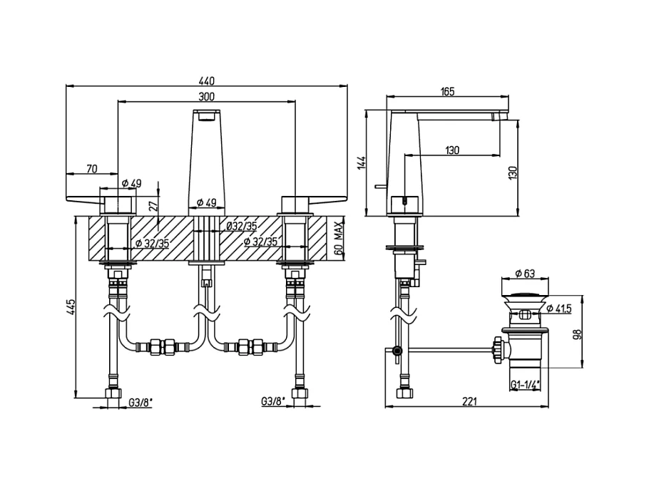 Mitigeur lavabo 3 trous VILLEROY ET BOCH Conum sans tirette Or brossé