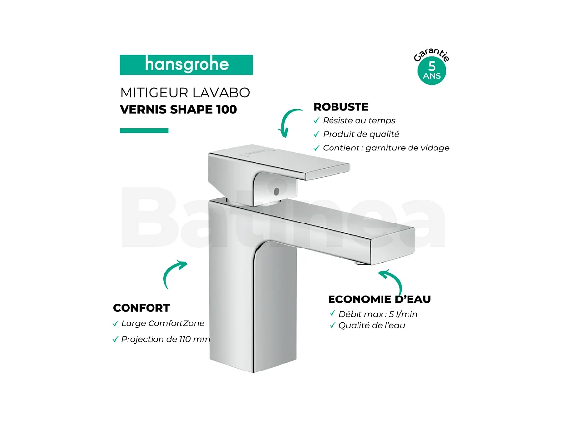 Mitigeur lavabo HANSGROHE Vernis Shape 100 Chromé sans tirette ni vidage