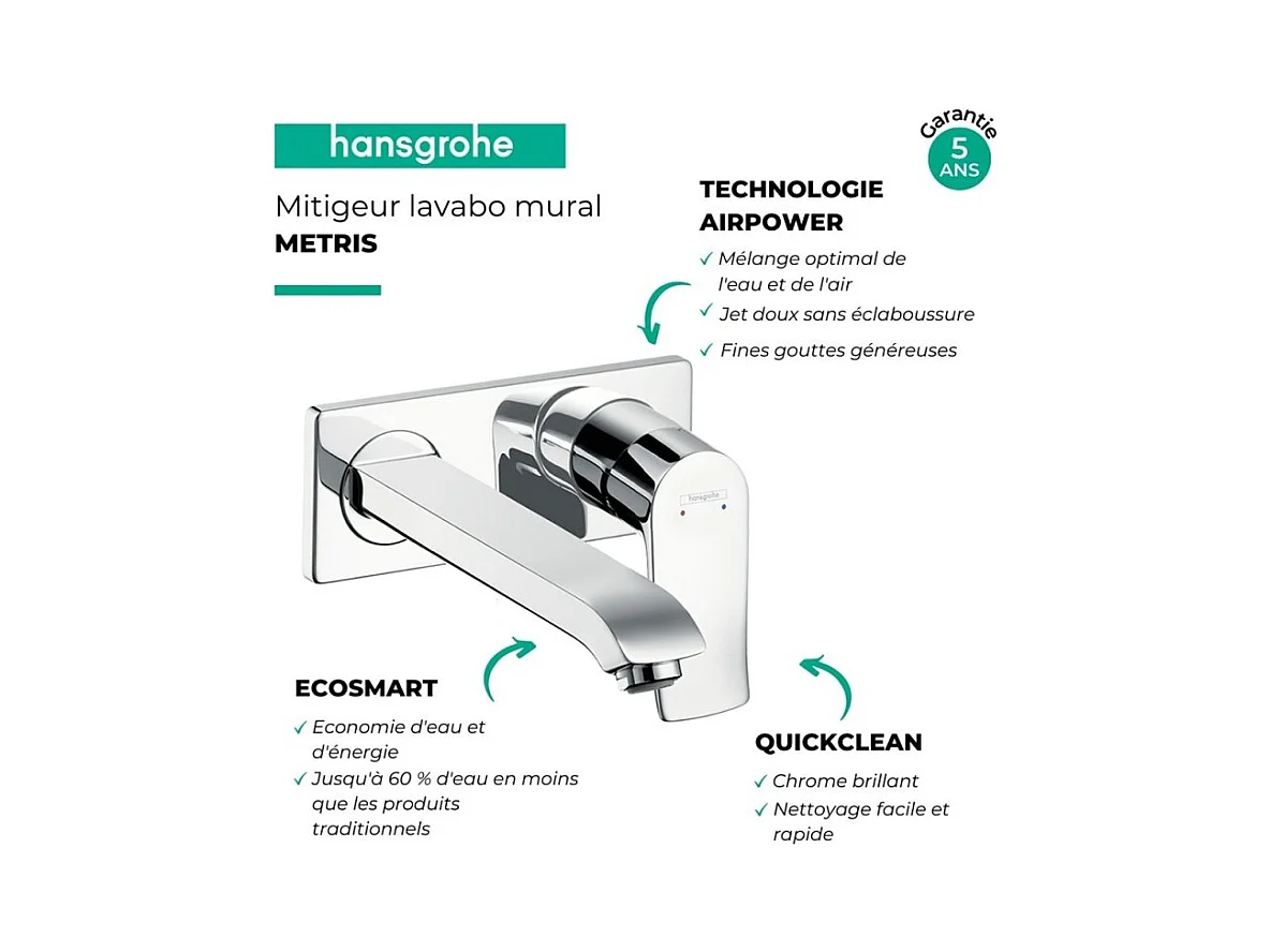 Mitigeur lavabo mural HANSGROHE Metris Economie d'eau 16,5 cm