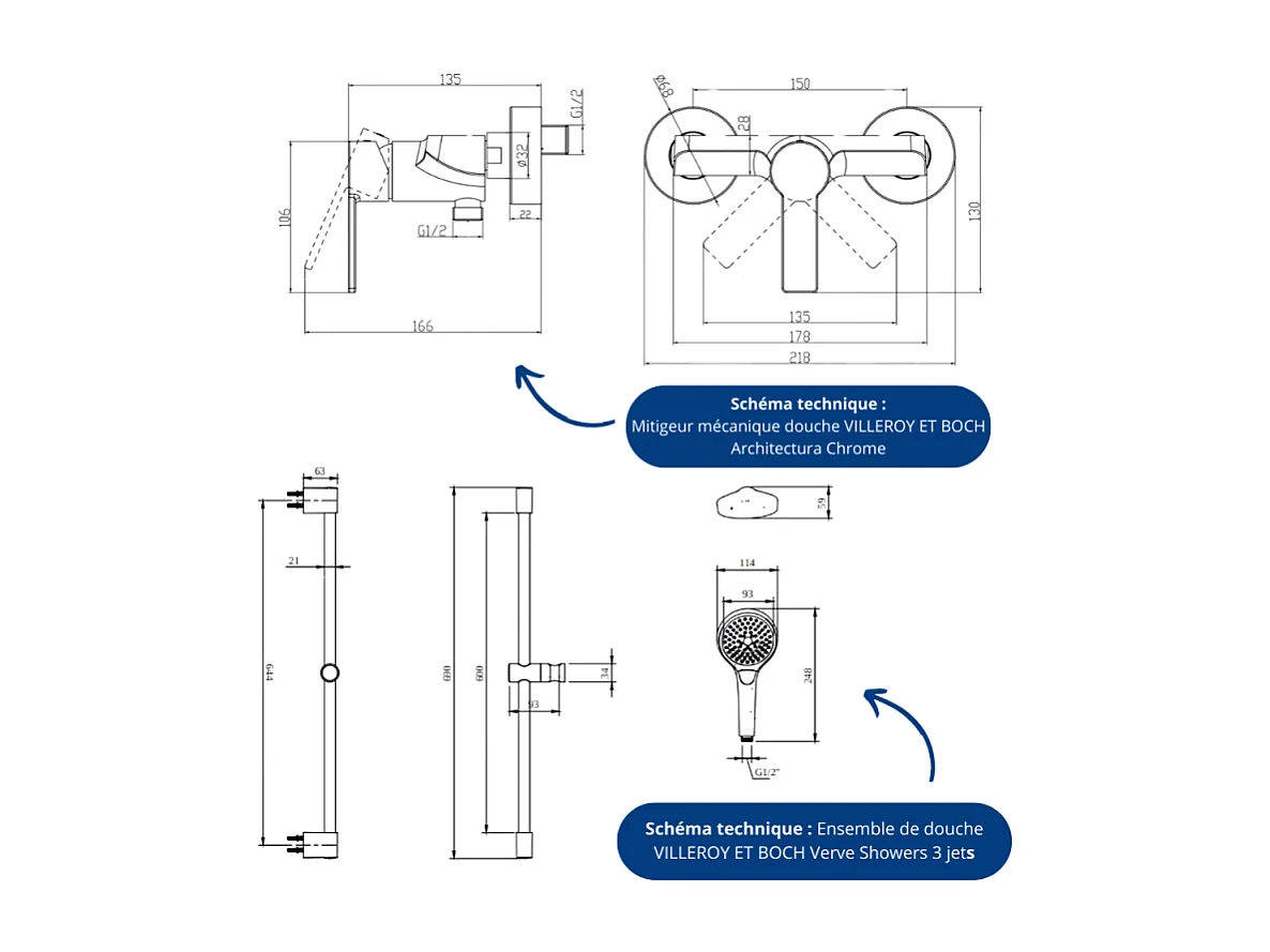 Mitigeur mécanique douche VILLEROY ET BOCH Architectura Chrome + Ensemble de douche VILLEROY ET BOCH Verve Showers 3 jets Chrome