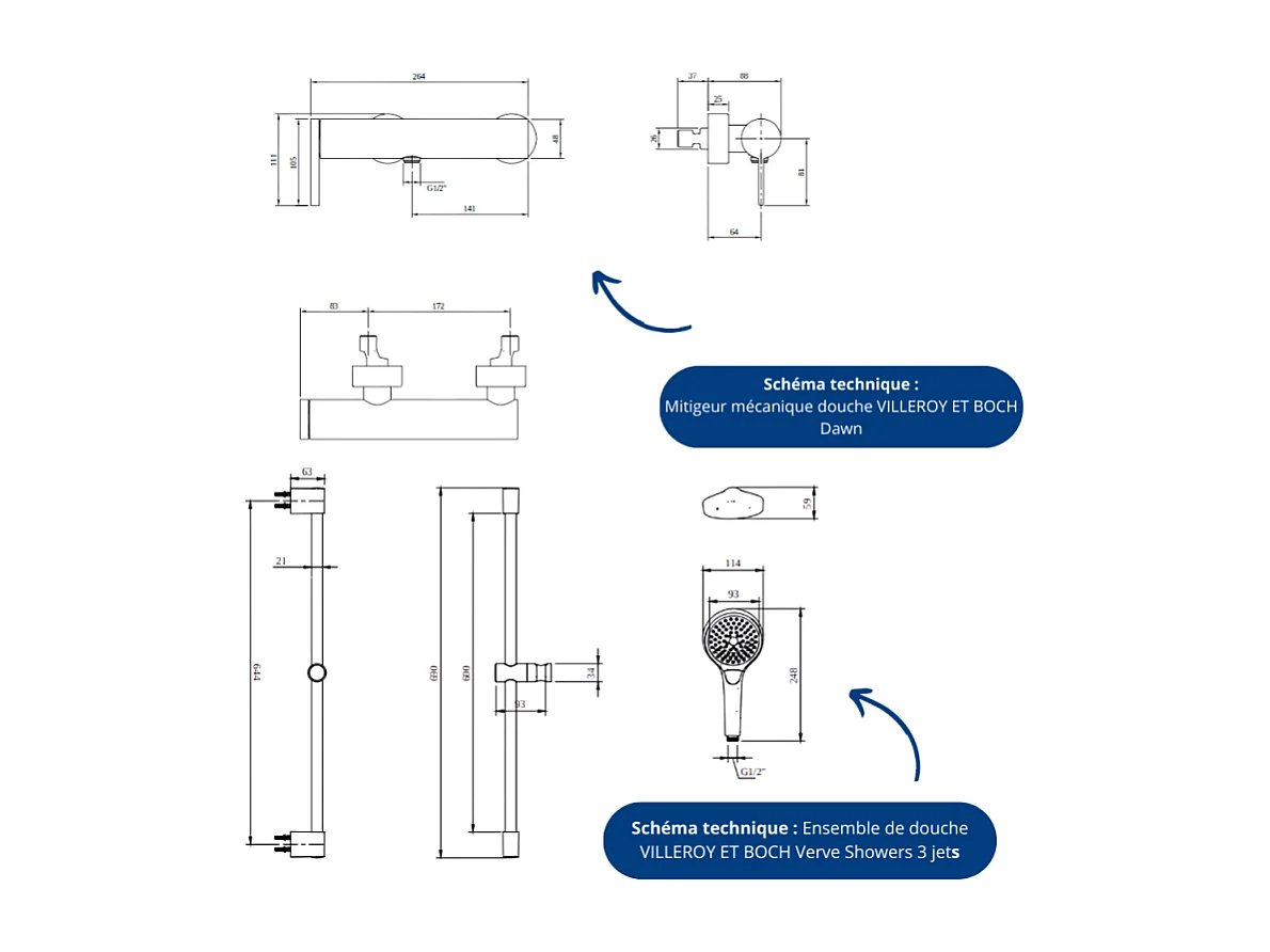 Mitigeur mécanique douche VILLEROY ET BOCH Dawn Noir mat + Ensemble de douche VILLEROY ET BOCH Verve Showers 3 jets Noir mat