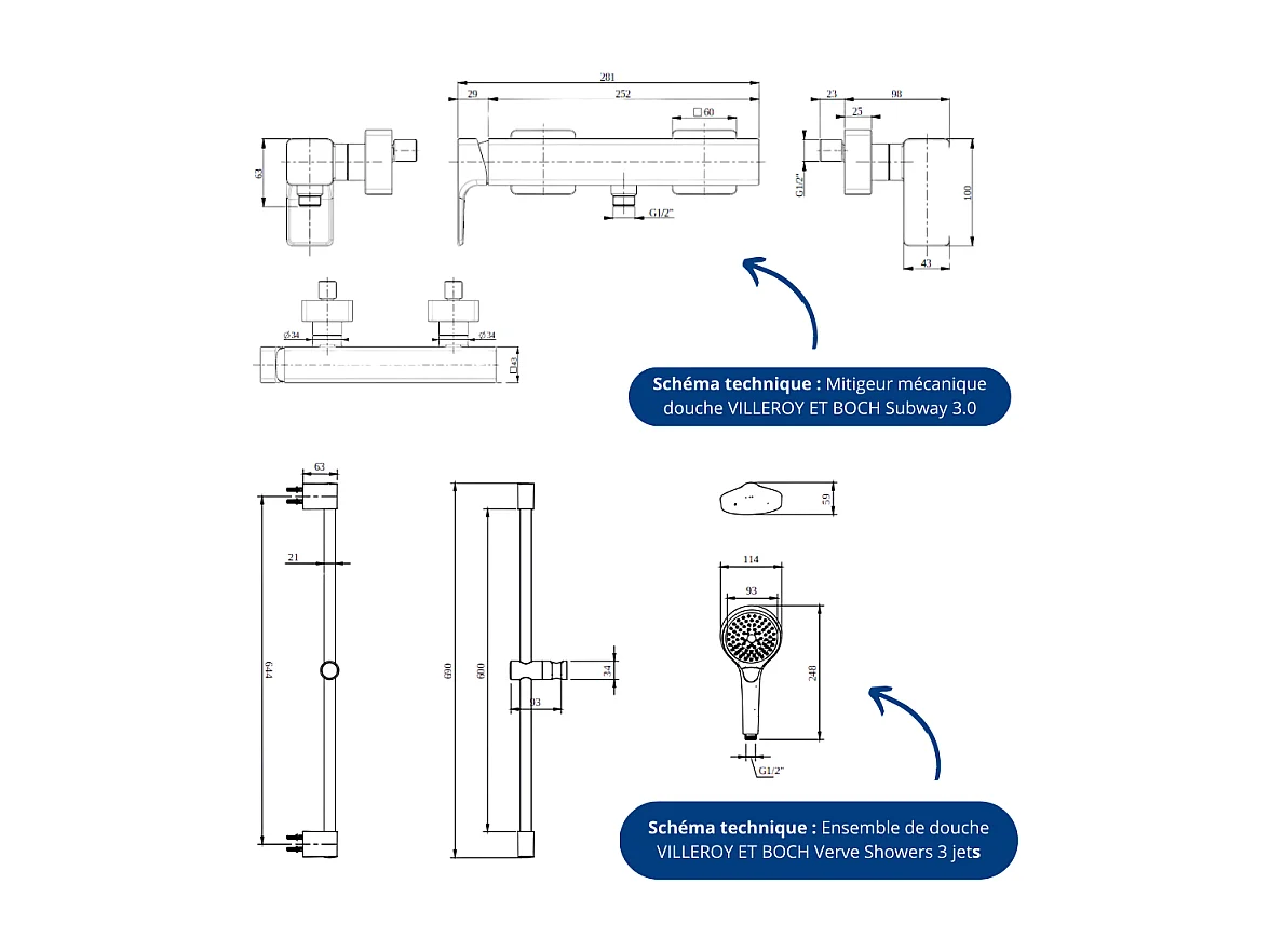 Mitigeur mécanique douche VILLEROY ET BOCH Subway 3.0 Chrome + Ensemble de douche VILLEROY ET BOCH Verve Showers 3 jets Noir mat