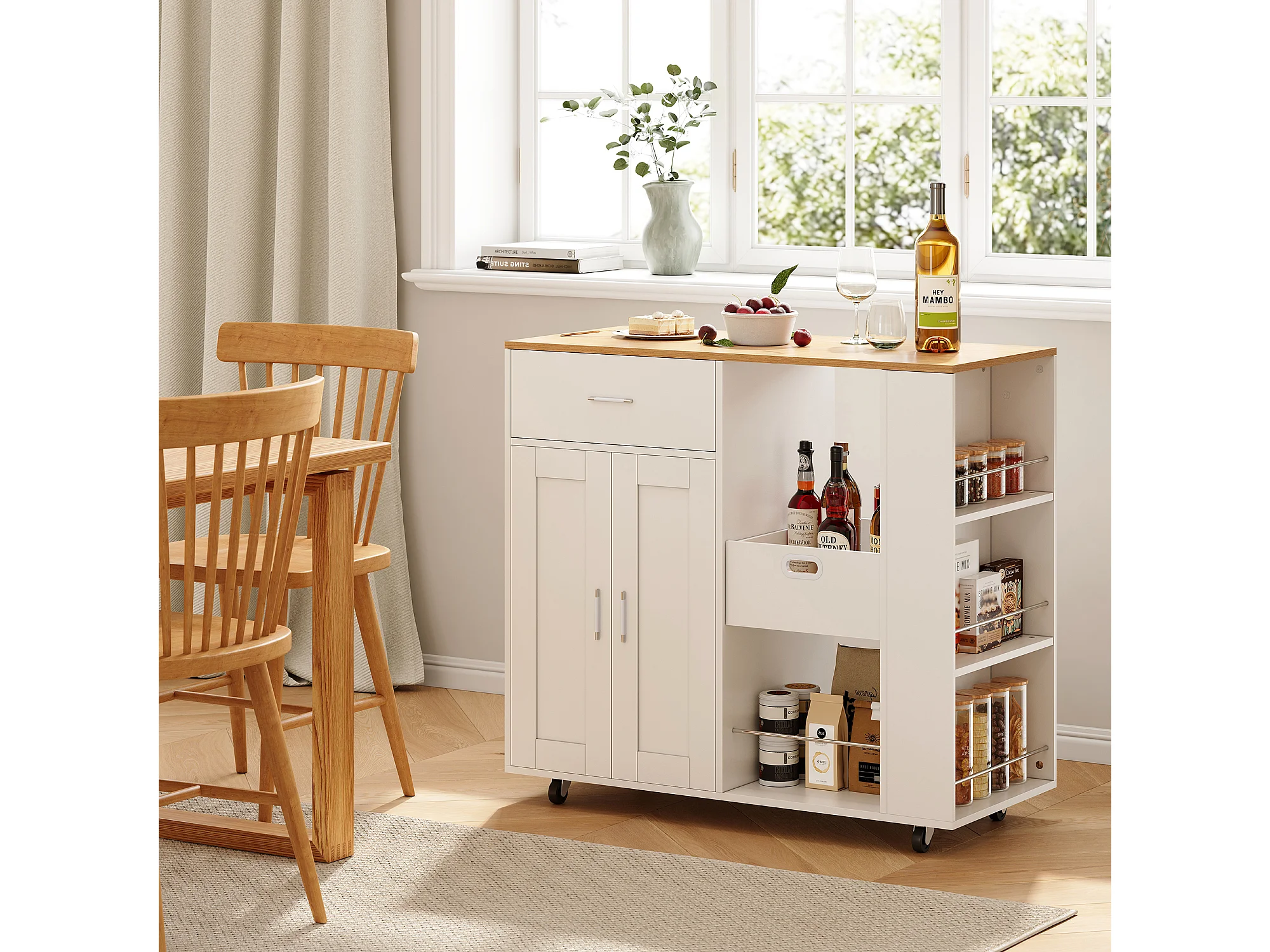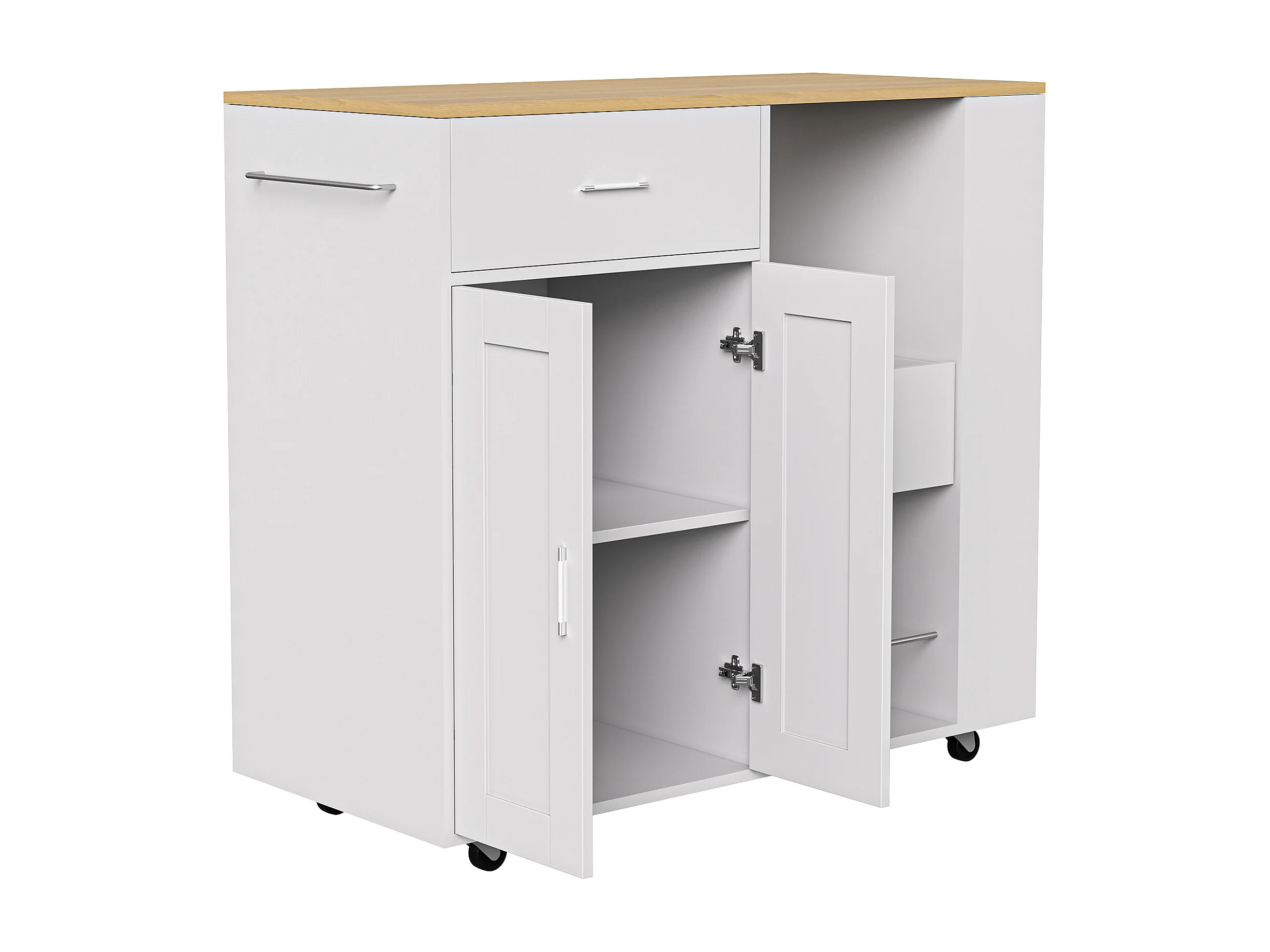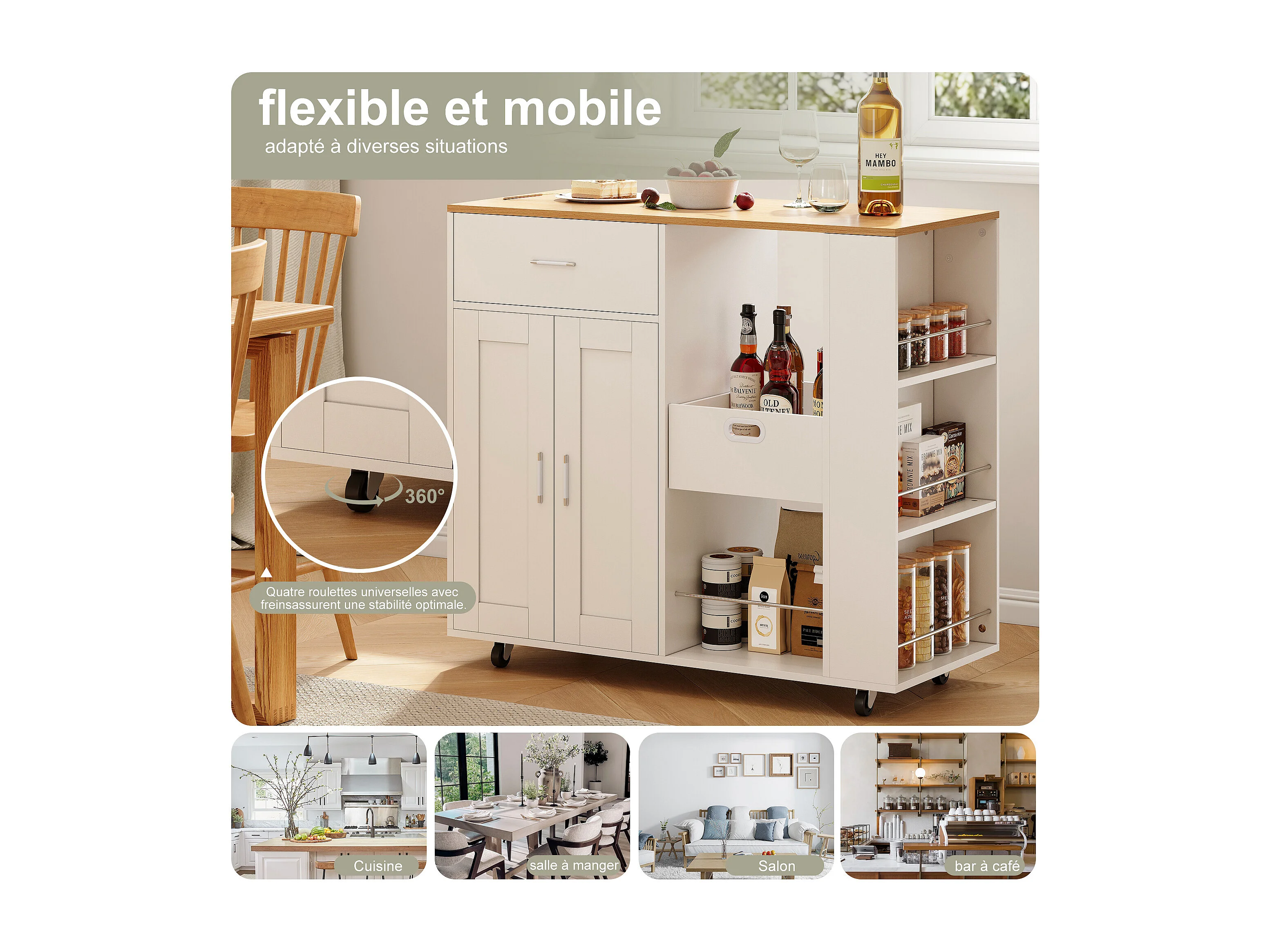 Mobile île de cuisine, avec tiroir, étagère ouverte et grand armoire, chariot de cuisine avec roue, côté avec 3 étagère de condiments-blanc