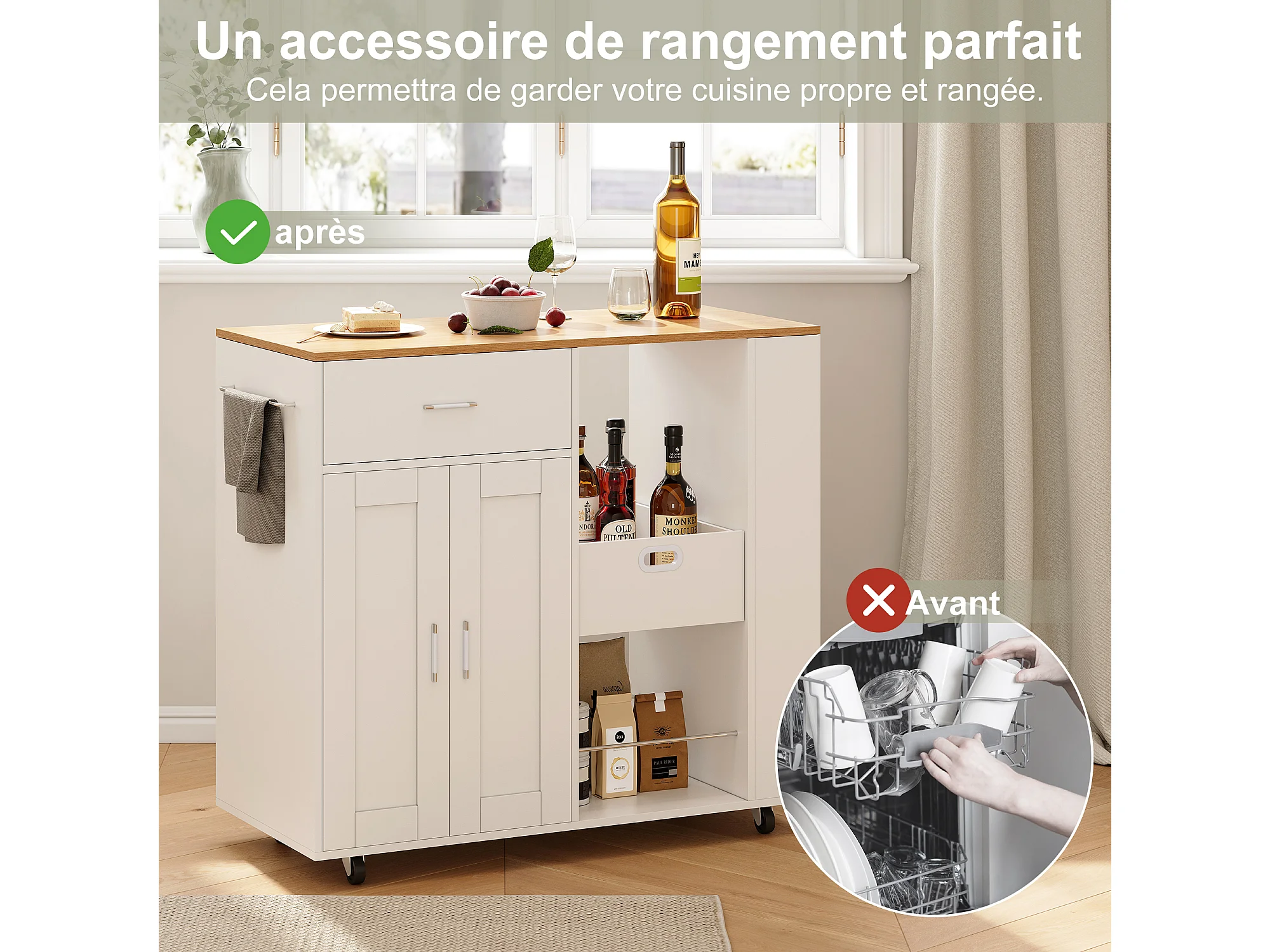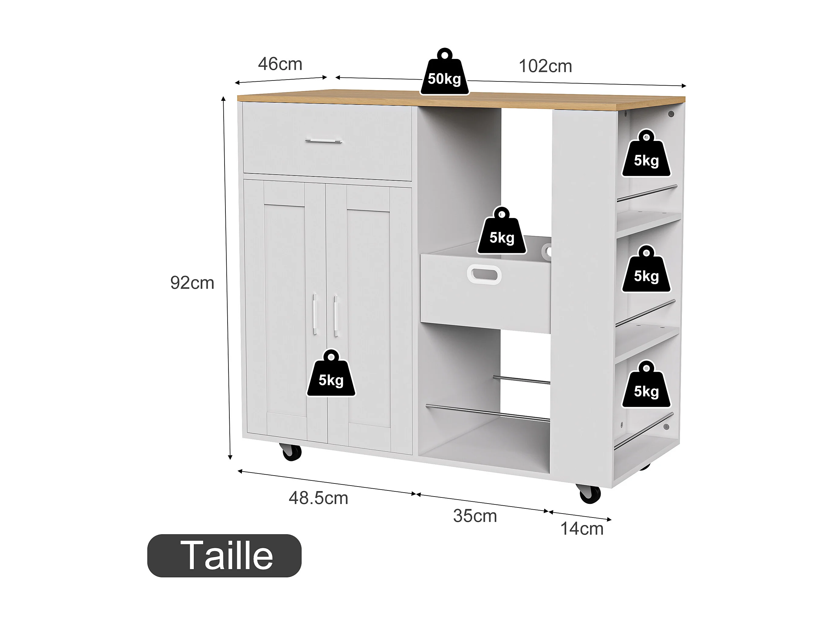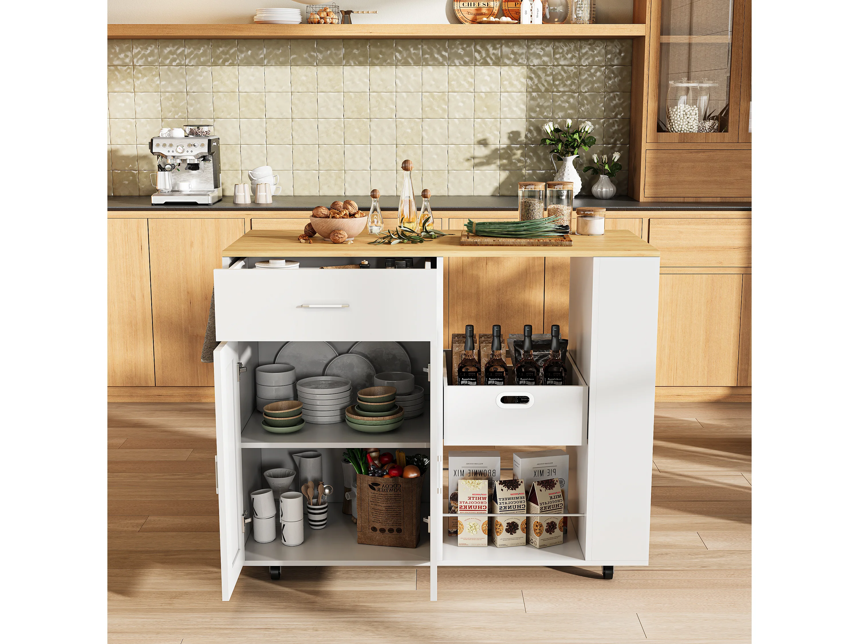Mobile île de cuisine, avec tiroir, étagère ouverte et grand armoire, chariot de cuisine avec roue, côté avec 3 étagère de condiments-blanc
