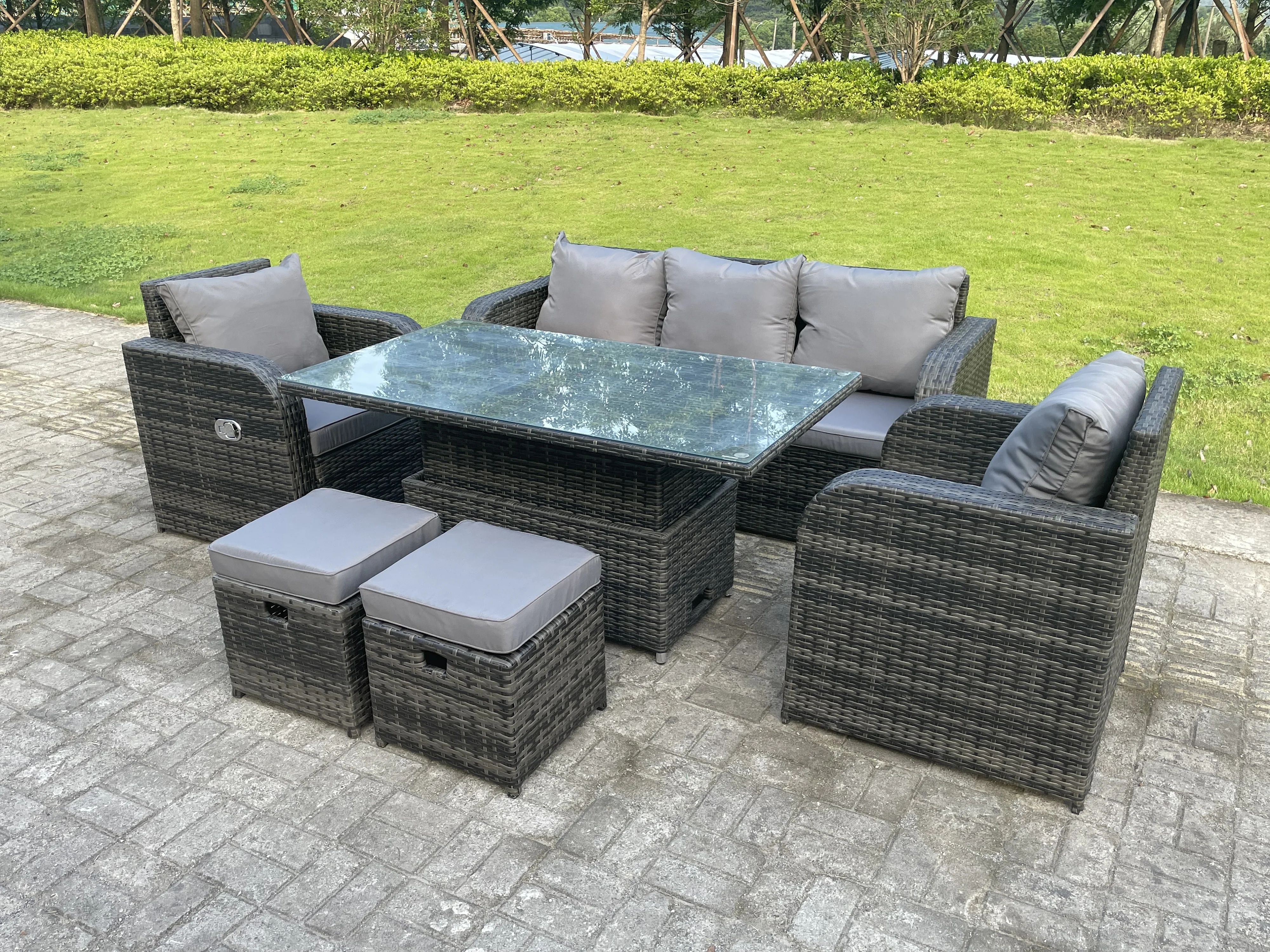 Mobilier À Dîner De Jardin en rotin ave Canapé Chaises inclinable Tabourets Table à manger réglable en hauteur Mélange gris foncé