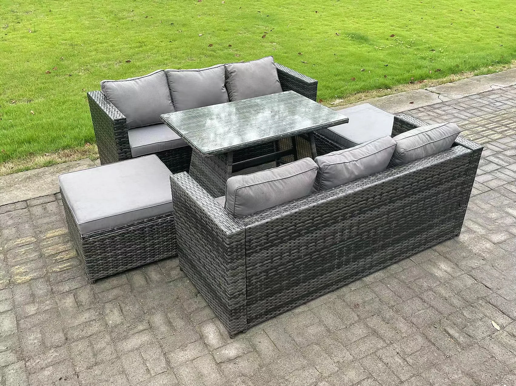Mobilier d'extérieur en rotin 7 places Canapé Salle à manger de jardin avec table à manger oblongue Grand tabouret Gris foncé Mixte