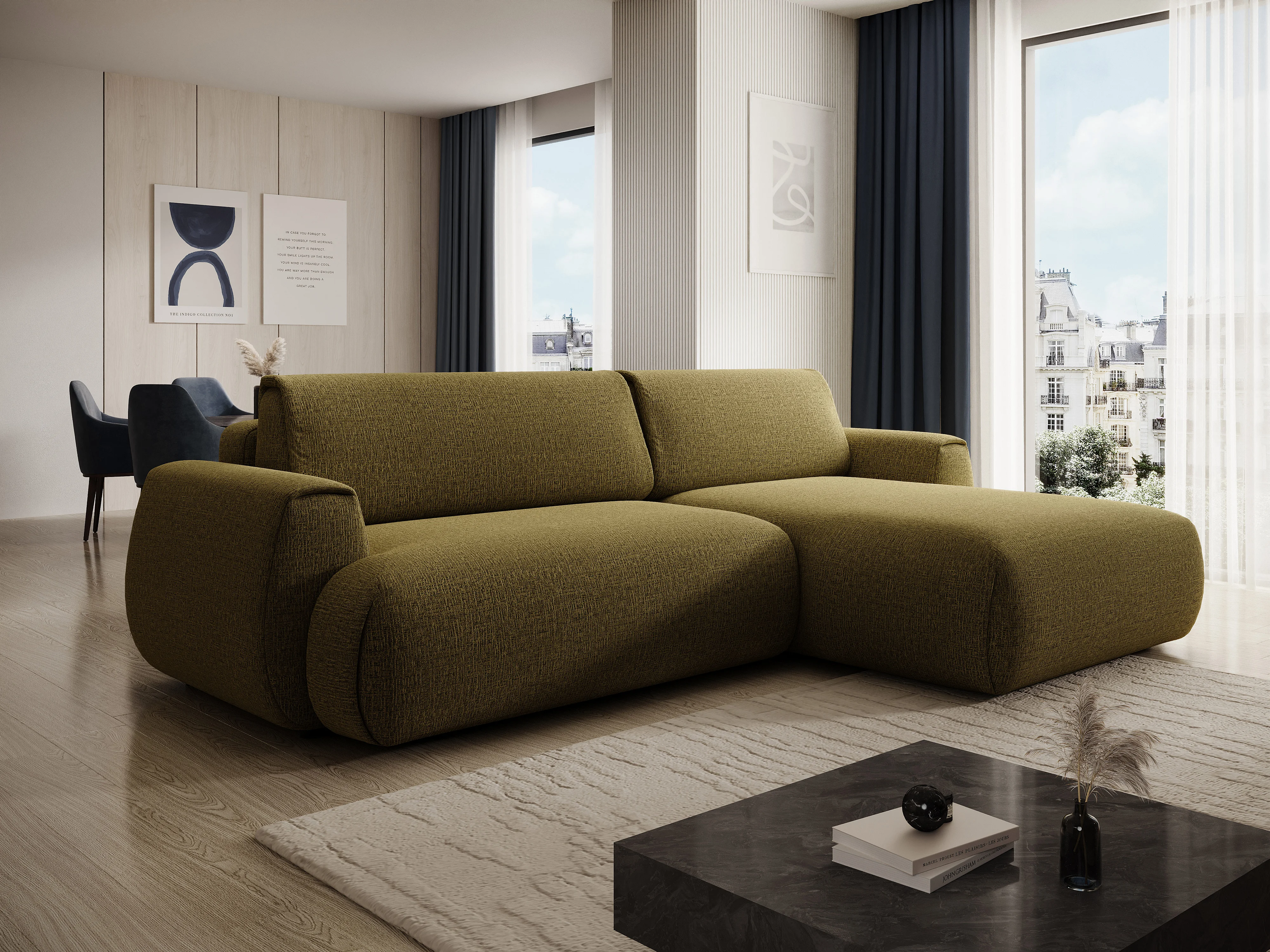 Canapé d'angle droit convertible en tissu chenille vert olive MONELIA