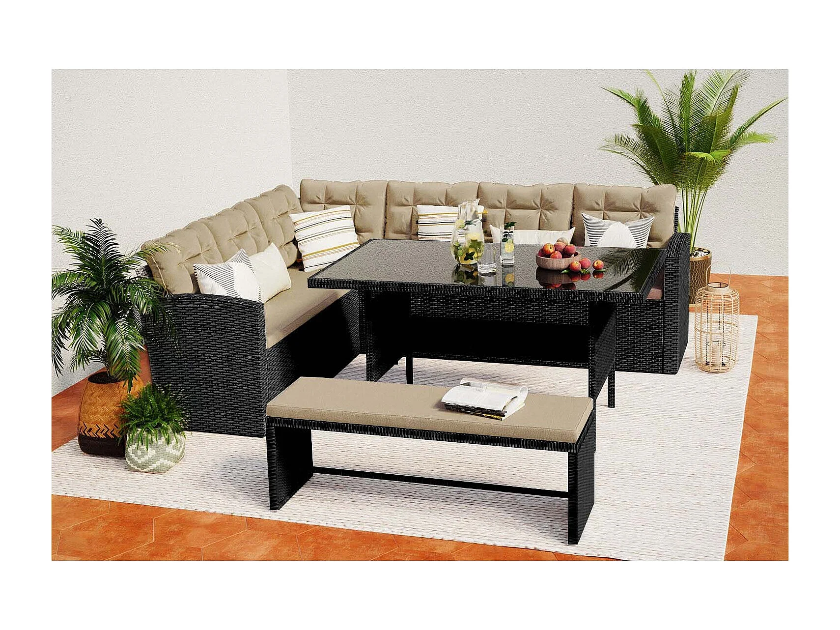 MOOREA - Salon de jardin modulable 8 places avec canapé d'angle en résine tressée gris foncé et écru