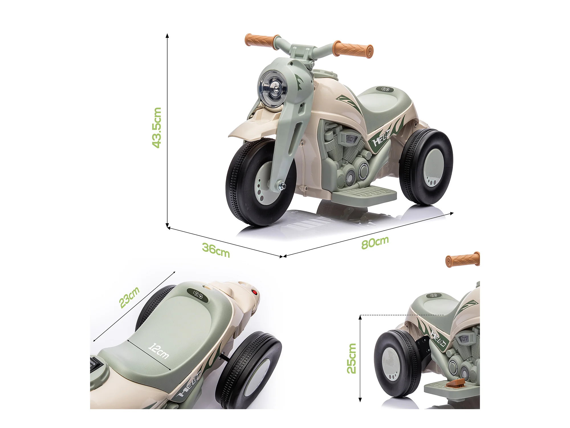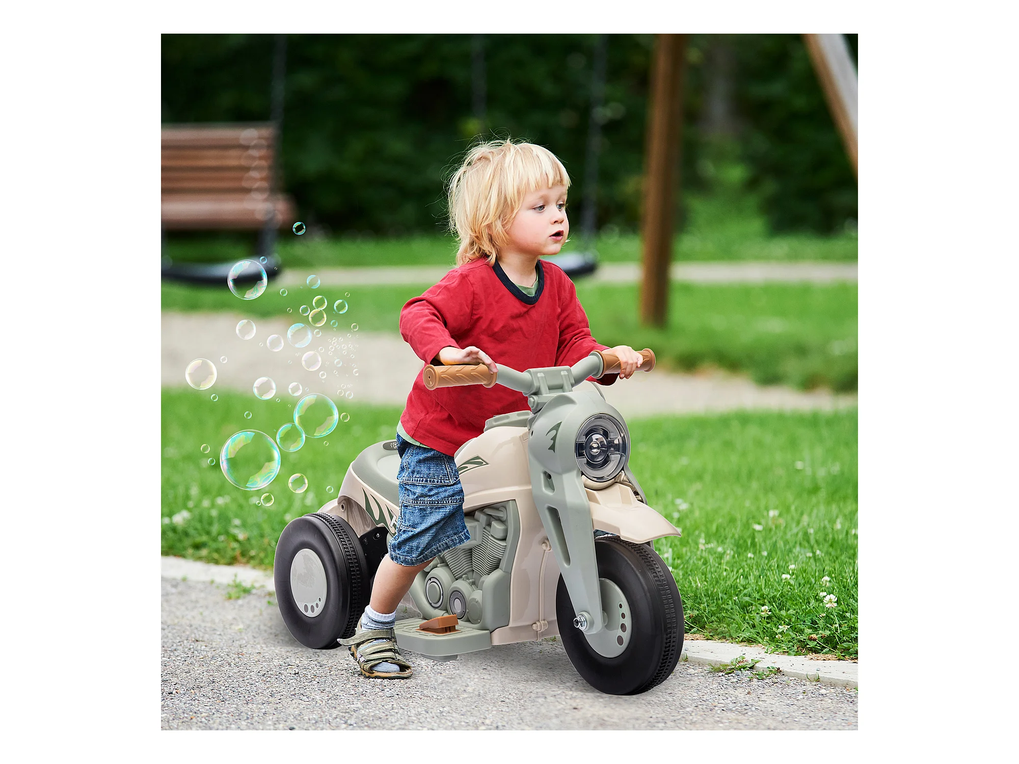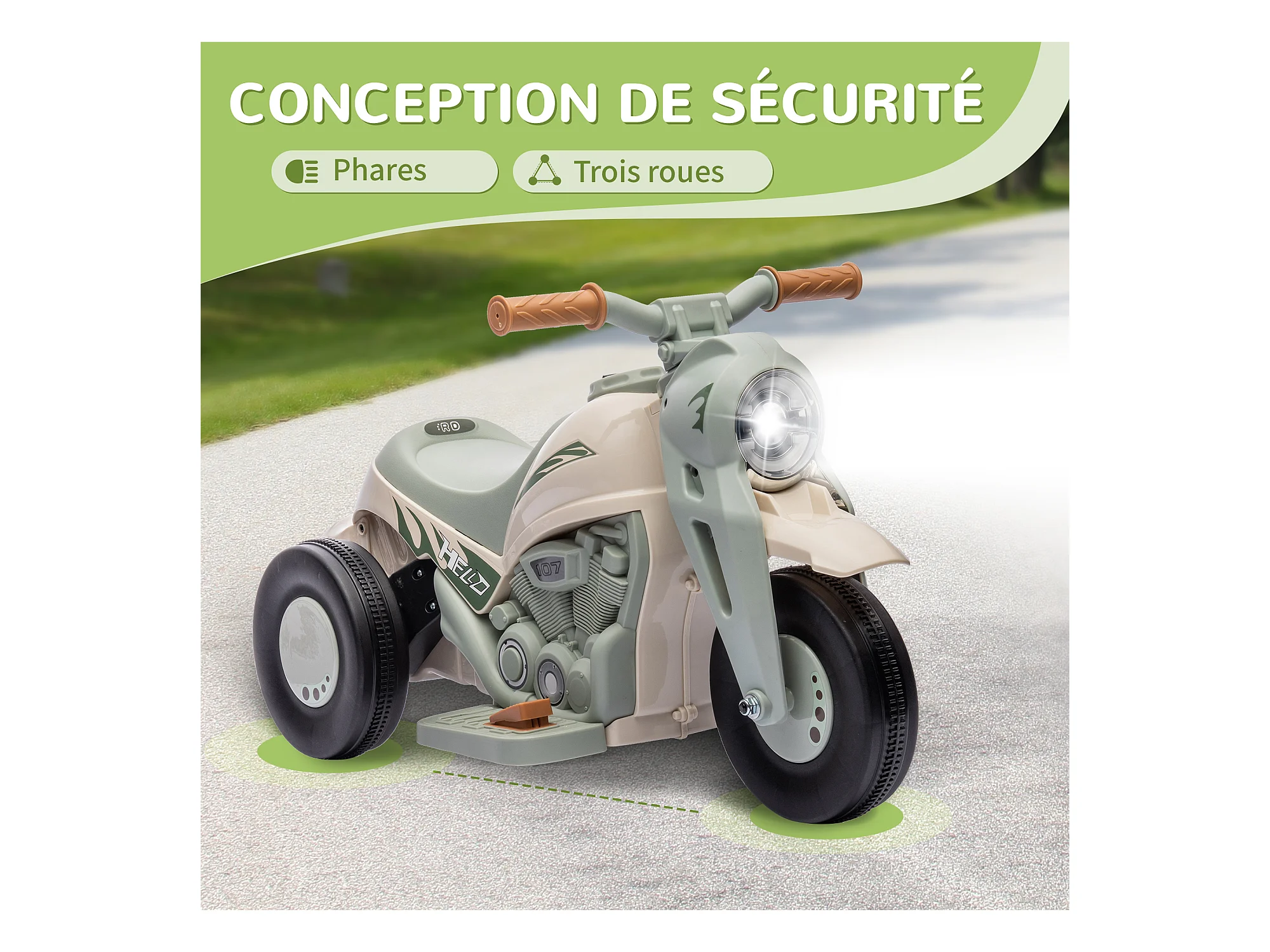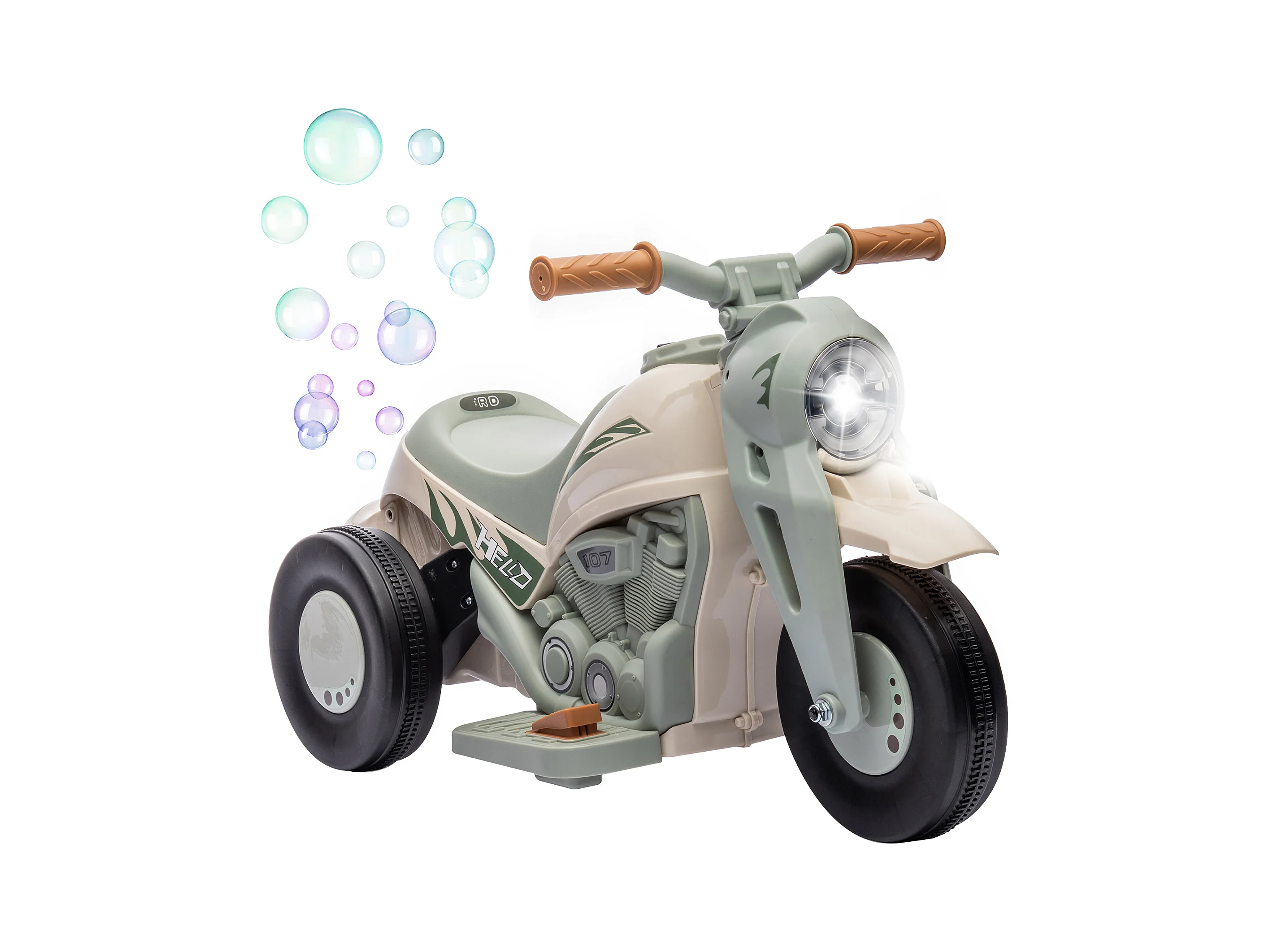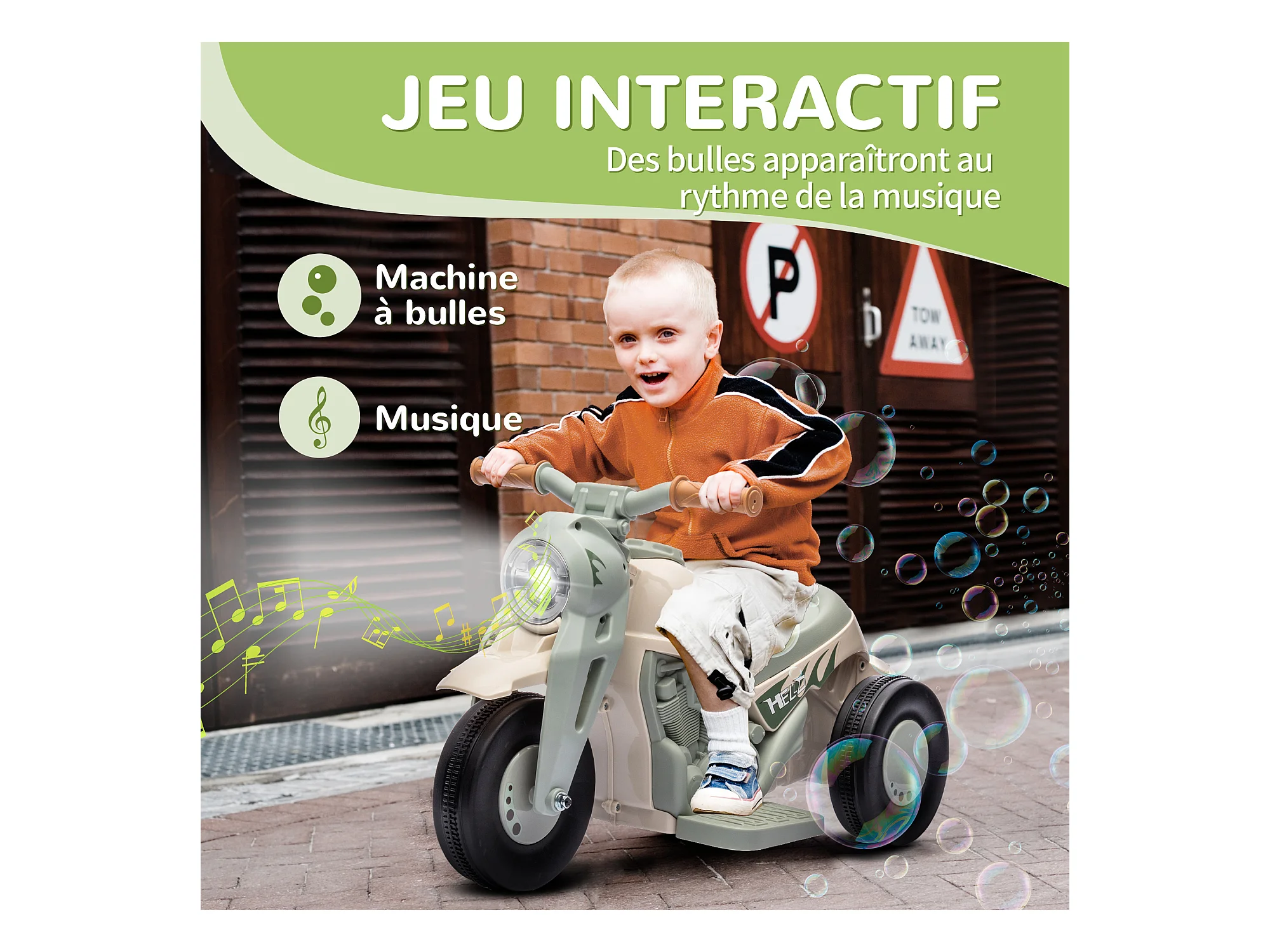 Moto électrique enfant chopper 6V env. 3Km/h 3 roues effets lumineux sonores fonction bulles vert beige