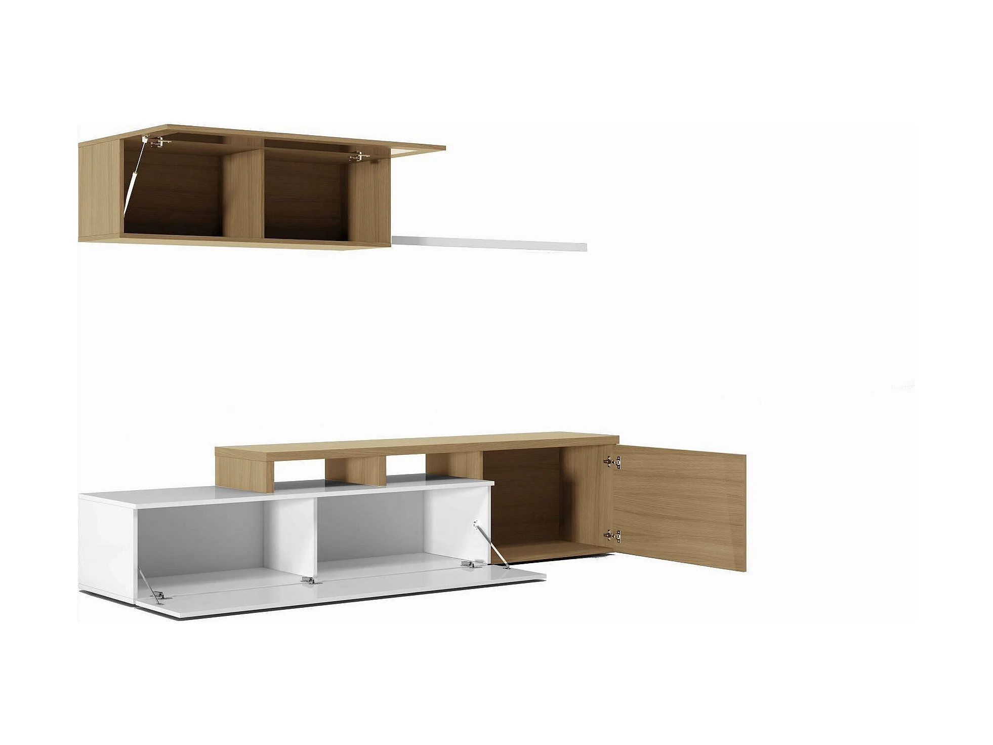 Ensemble mural Dabarb, meuble TV meuble de salon, Composition de salon réversible, Ensemble de salon d'angle, 200x41h44 cm, Chêne et Blanc Brillant