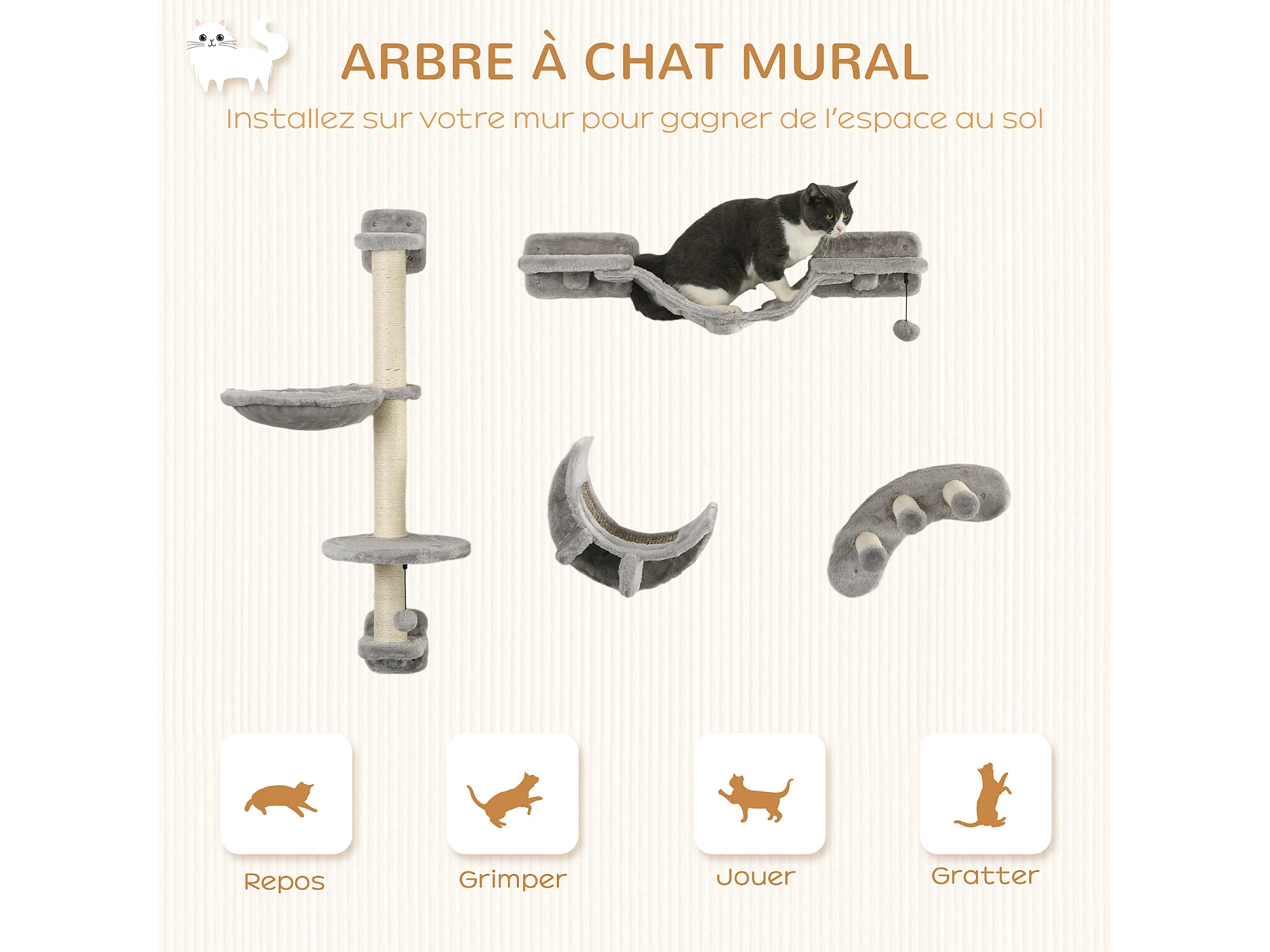 Mur d'escalade pour chat avec hamac passerelle planche à gratter et balles peluche sisal gris
