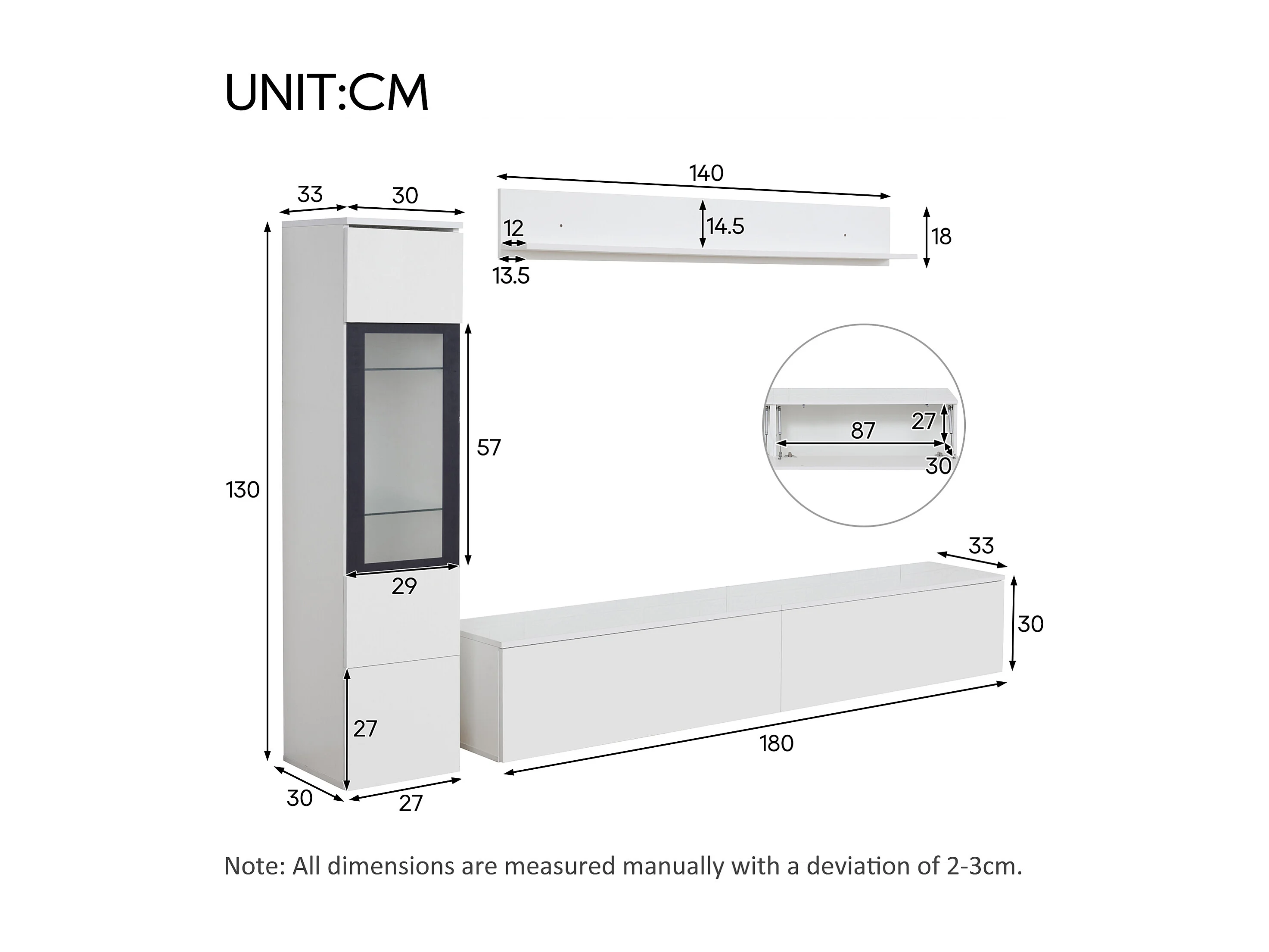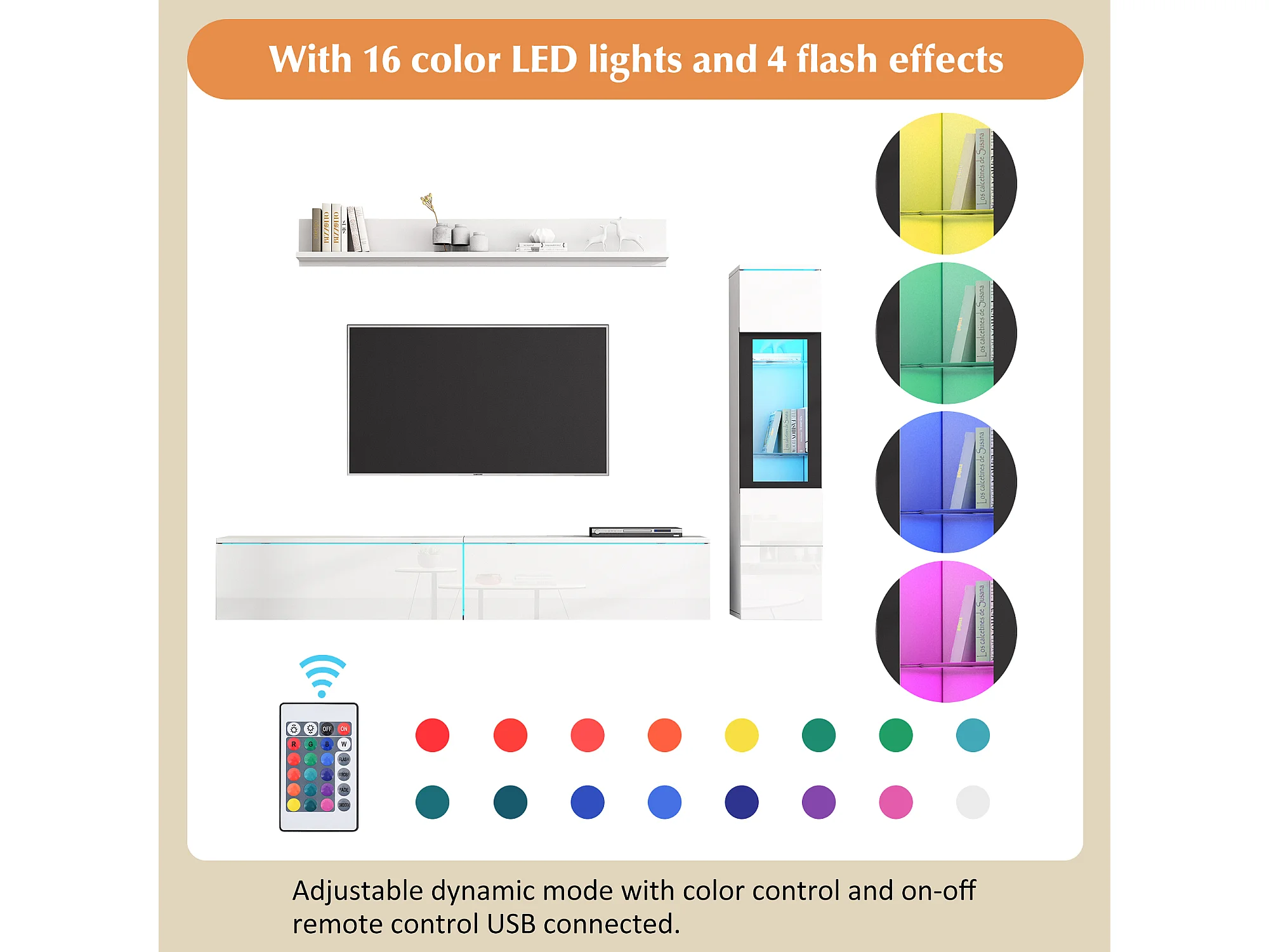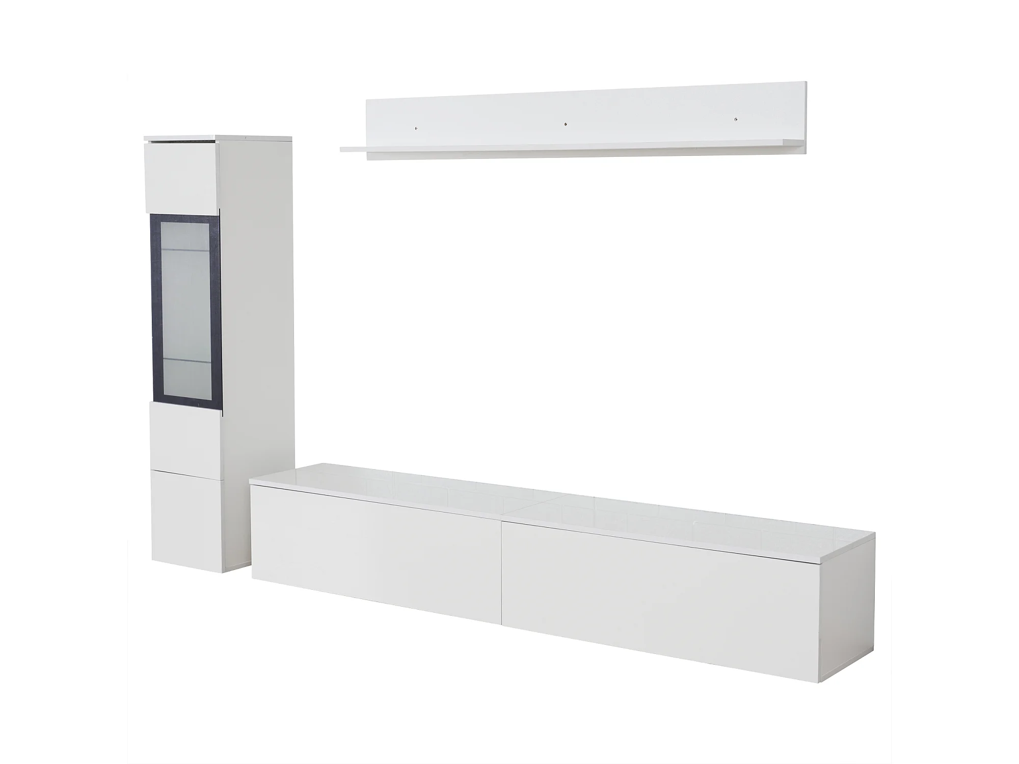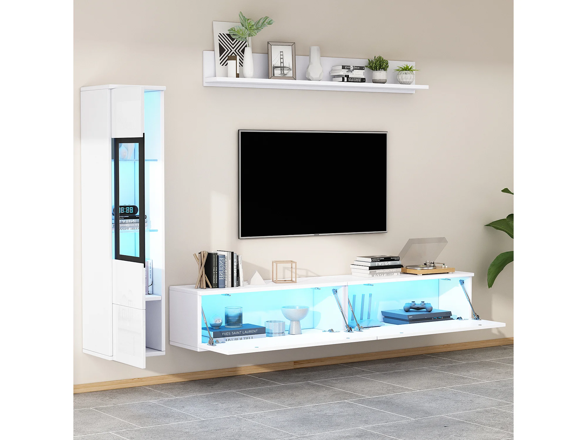 Mur TV avec rangements - Meuble TV + Vitrine avec LED + Présentoir - Blanc