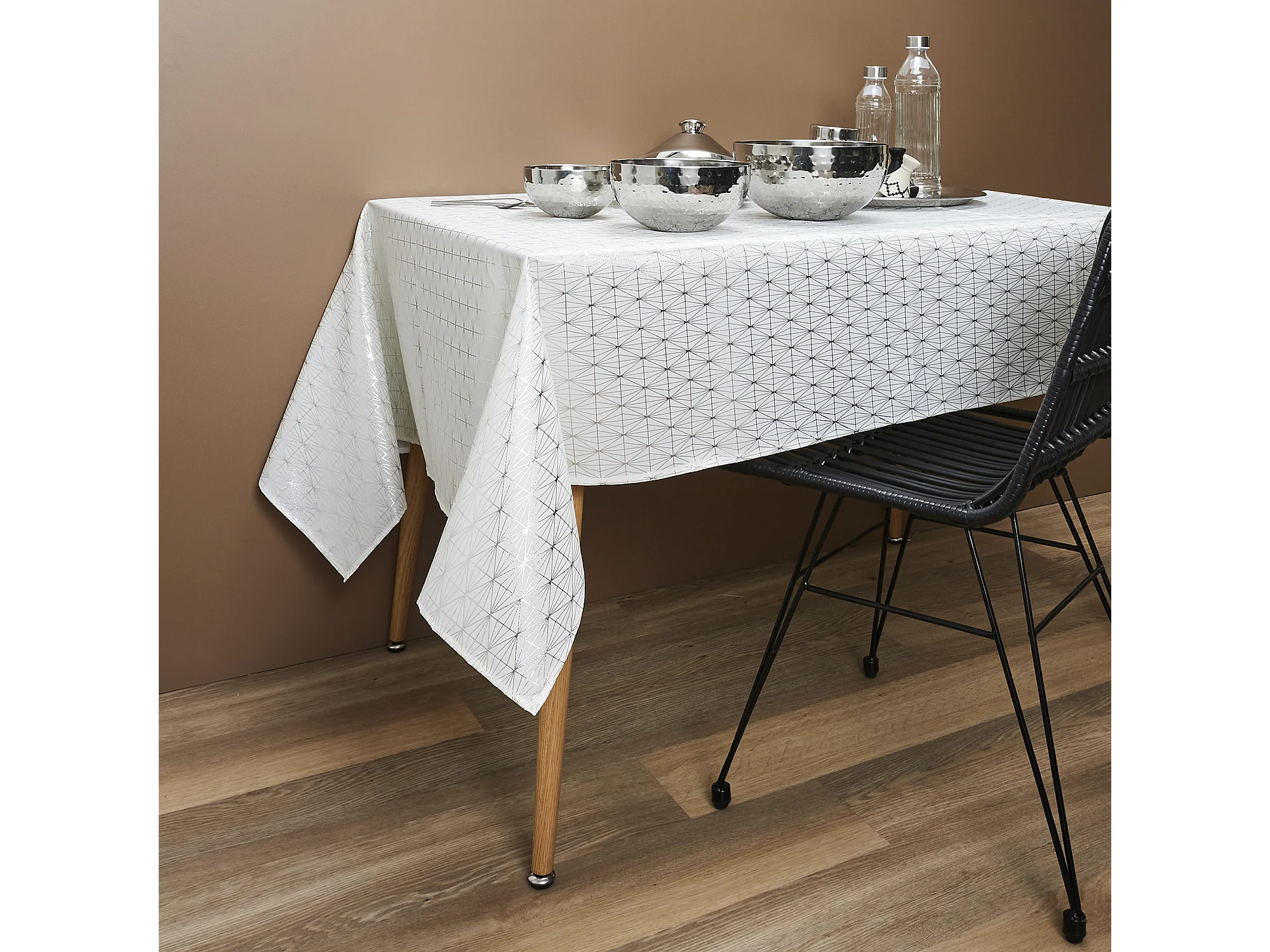 Nappe Motif Geometrique Argente 140x250cm Blanc, Argent