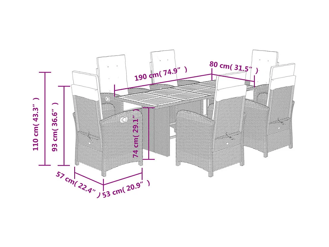 Nayo Ensemble à manger de jardin coussins 7pcs Noir Résine tressée