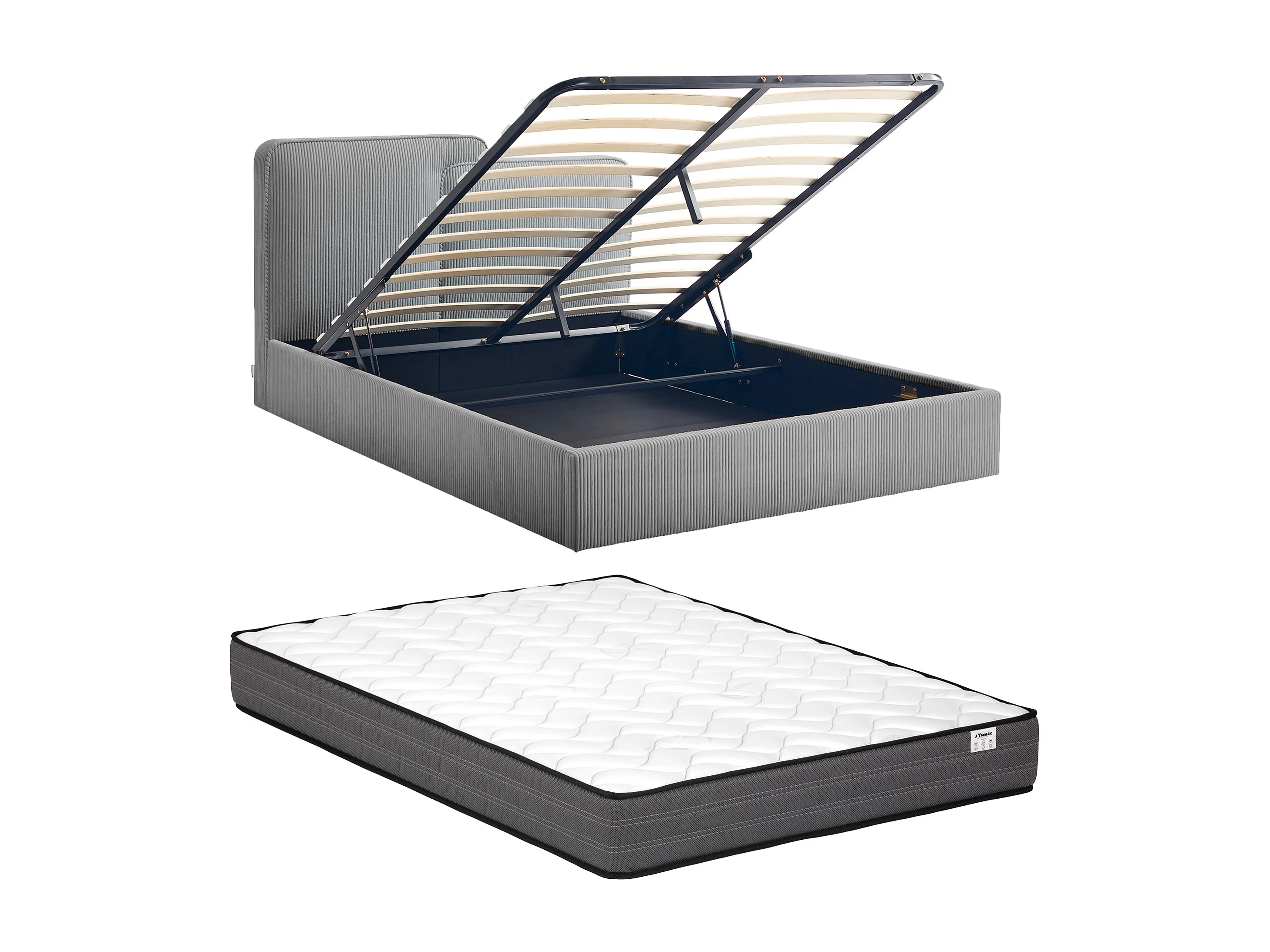 Lit coffre 140 x 190 cm - Velours côtelé - Gris + Matelas - NAYOLA