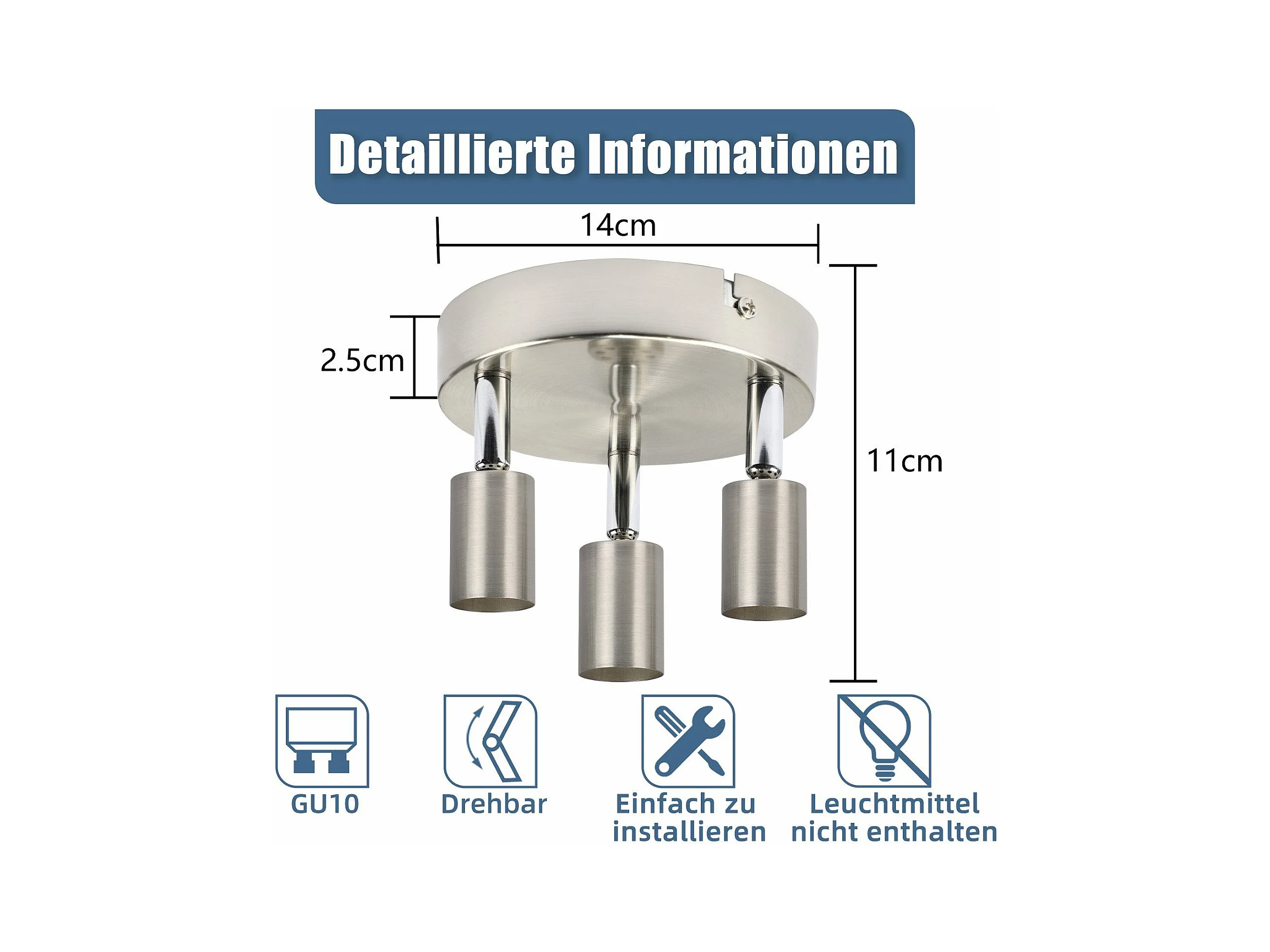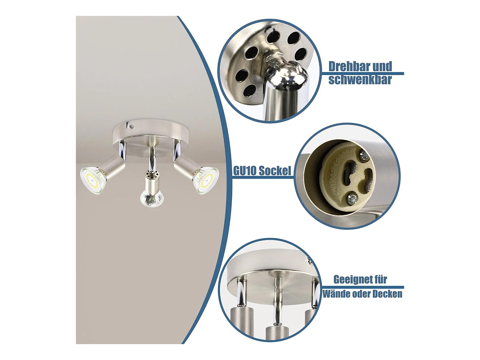 NETTLIFE 3 Spots de plafond couloir moderne GU10 pivotants à 330°lampe rotative en acier inoxydable pour salon chambre cuisine (sans ampoule)