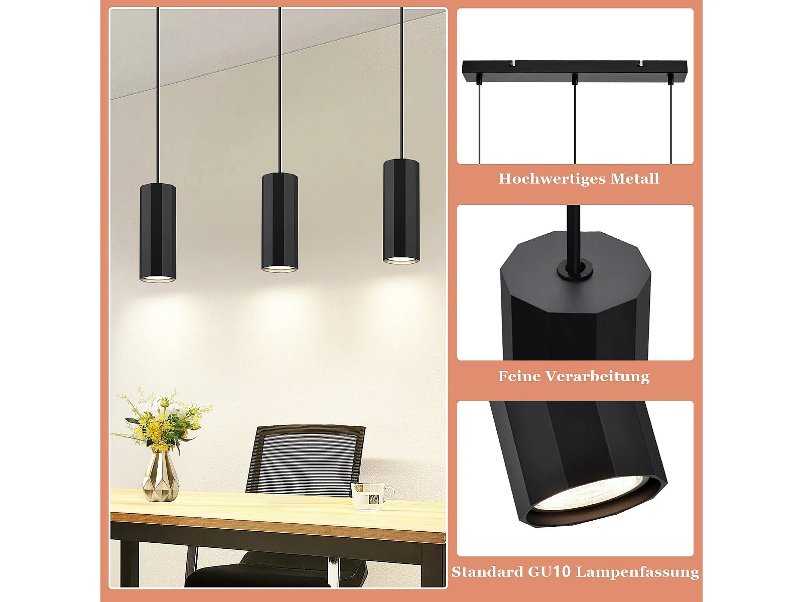 NETTLIFE Suspension métal noir diamètre 44 cm GU10 3 ampoules salon moderne industriel pour intérieur cuisine chambre salle à manger