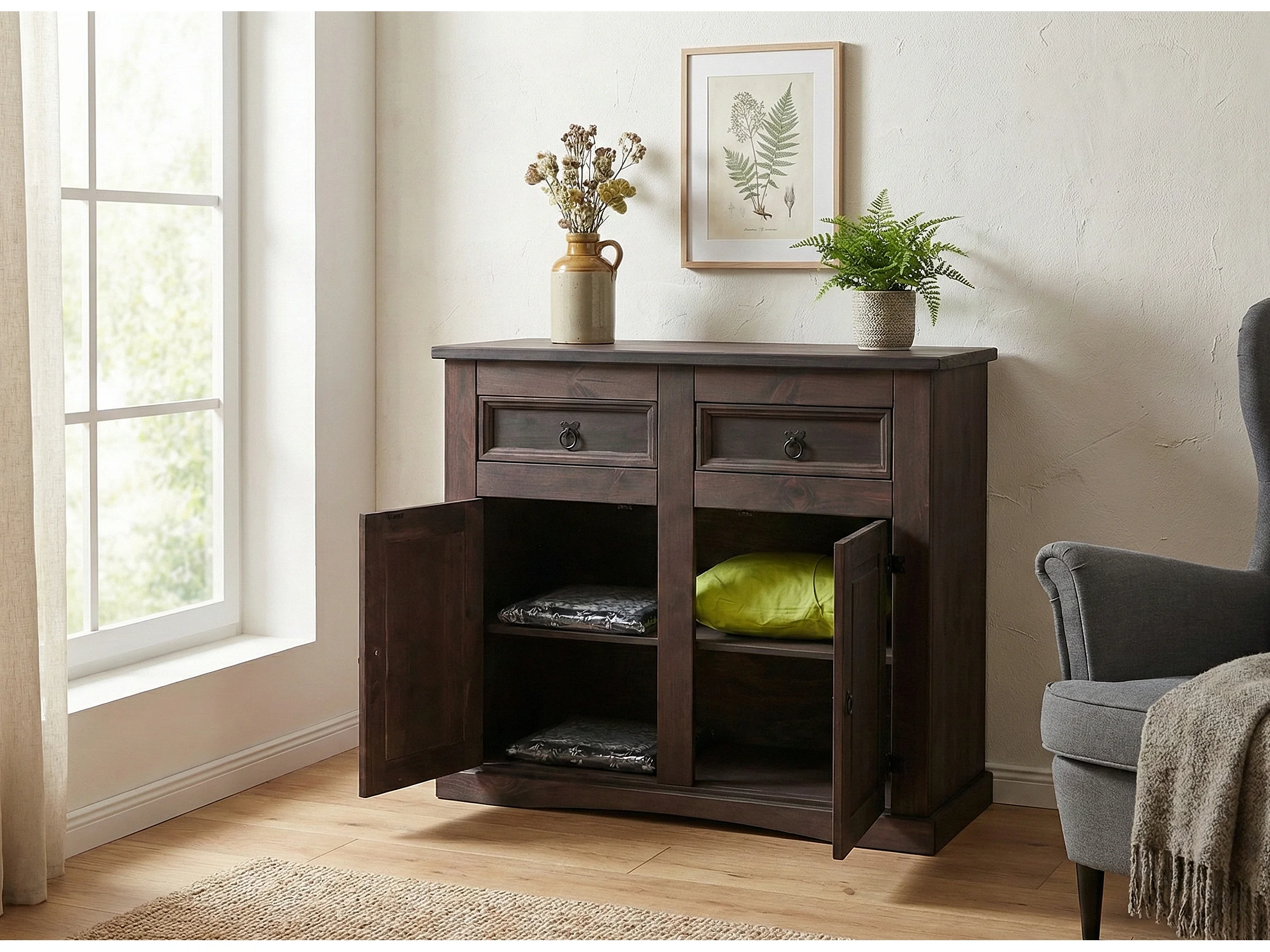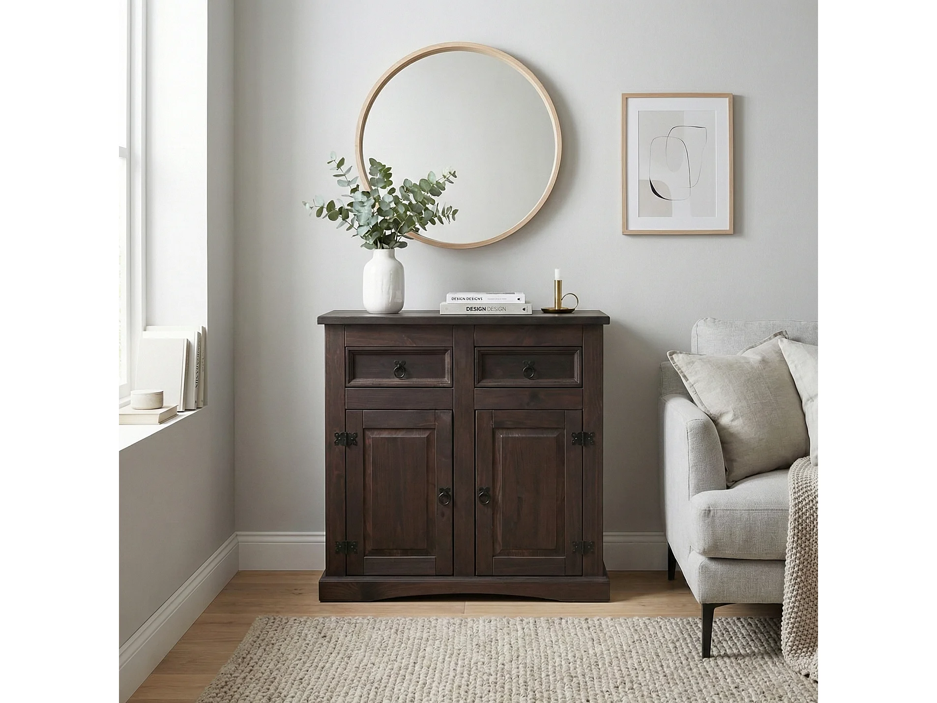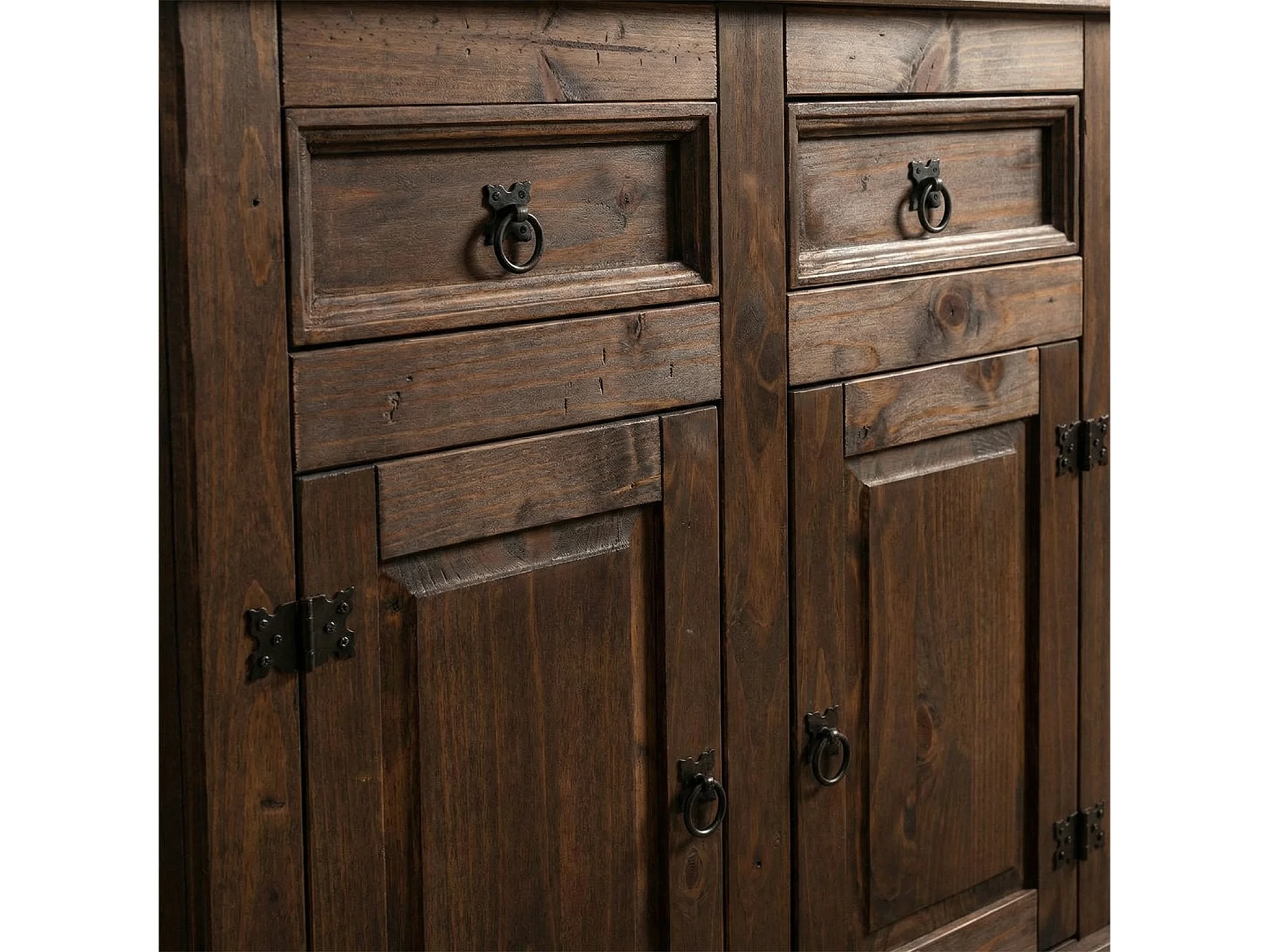 New Mexico Buffet, largeur 91 cm, hauteur 84 cm, avec 2 tiroirs et 2 portes, coloniales cémentées/ciré.