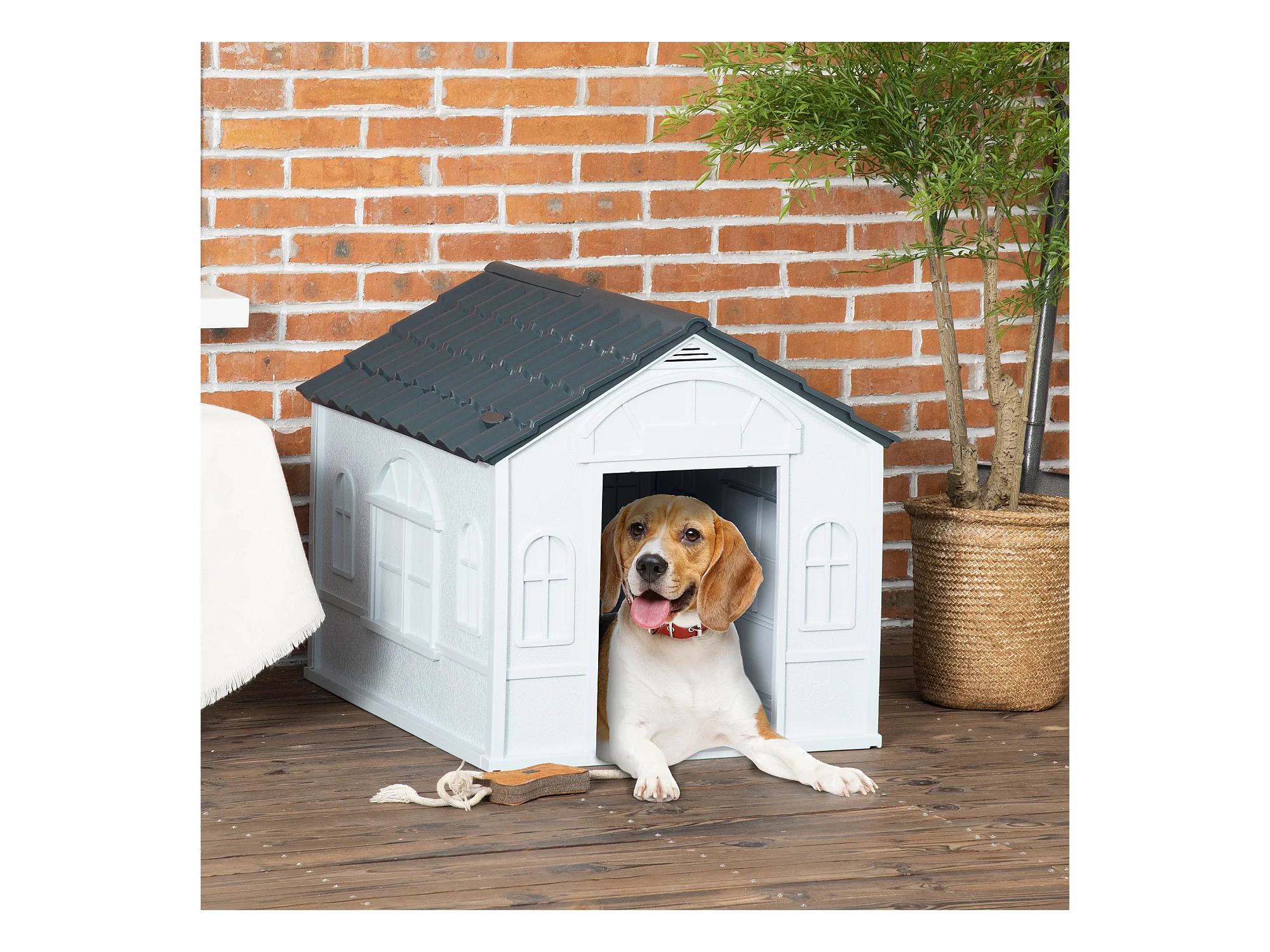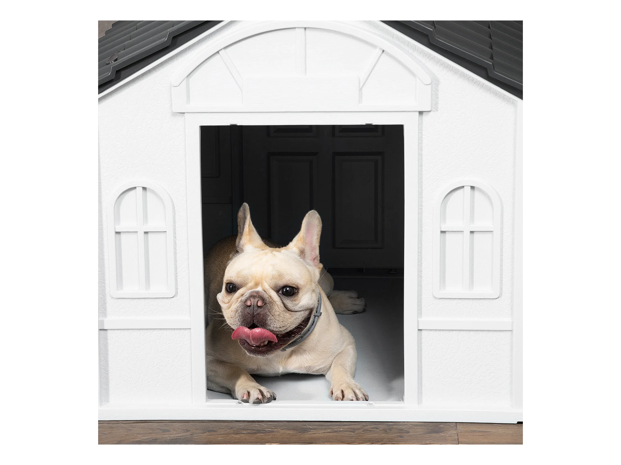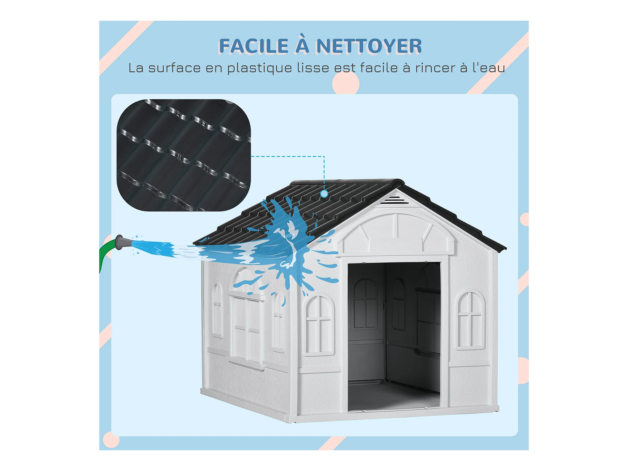 Niche chien style cottage dim. 65L x 75l x 63H cm - motifs fenêtres, porte, aération - PP blanc gris