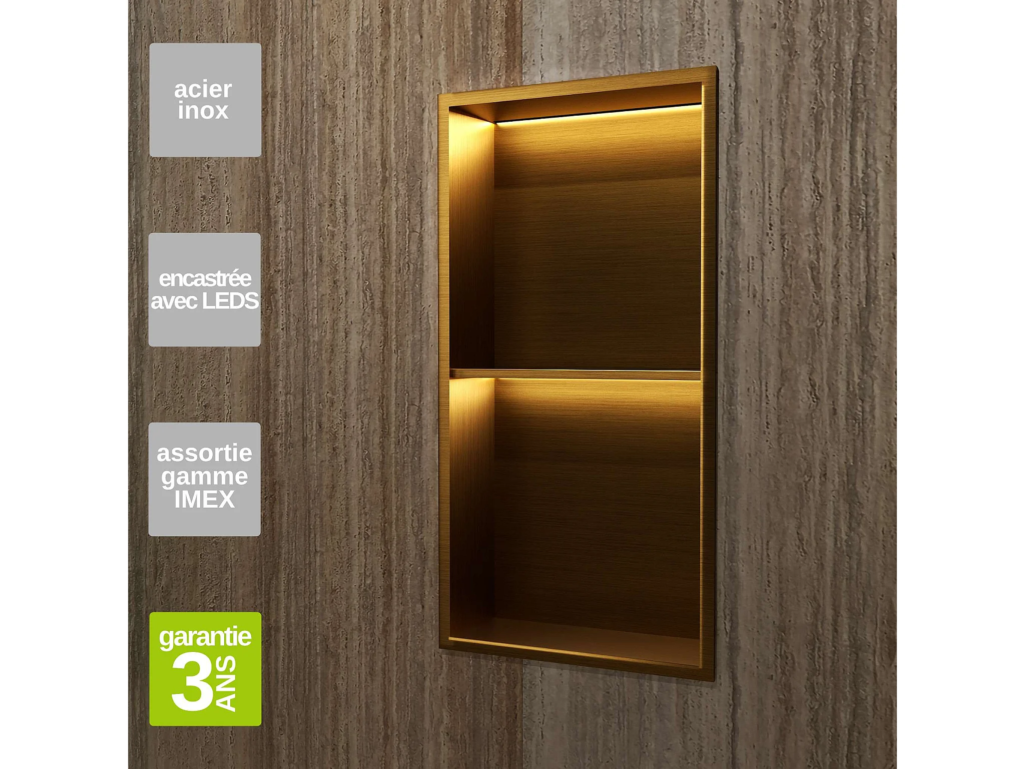 Niche de Douche Mural Éclairage Led 33 x 63 cm - Rangement Salle de Bain en finition Or Brossé - MARSHALL
