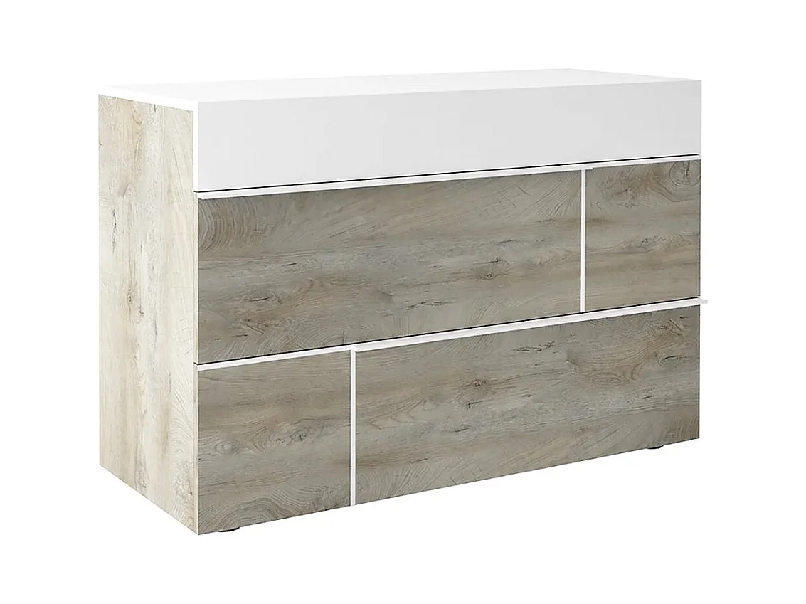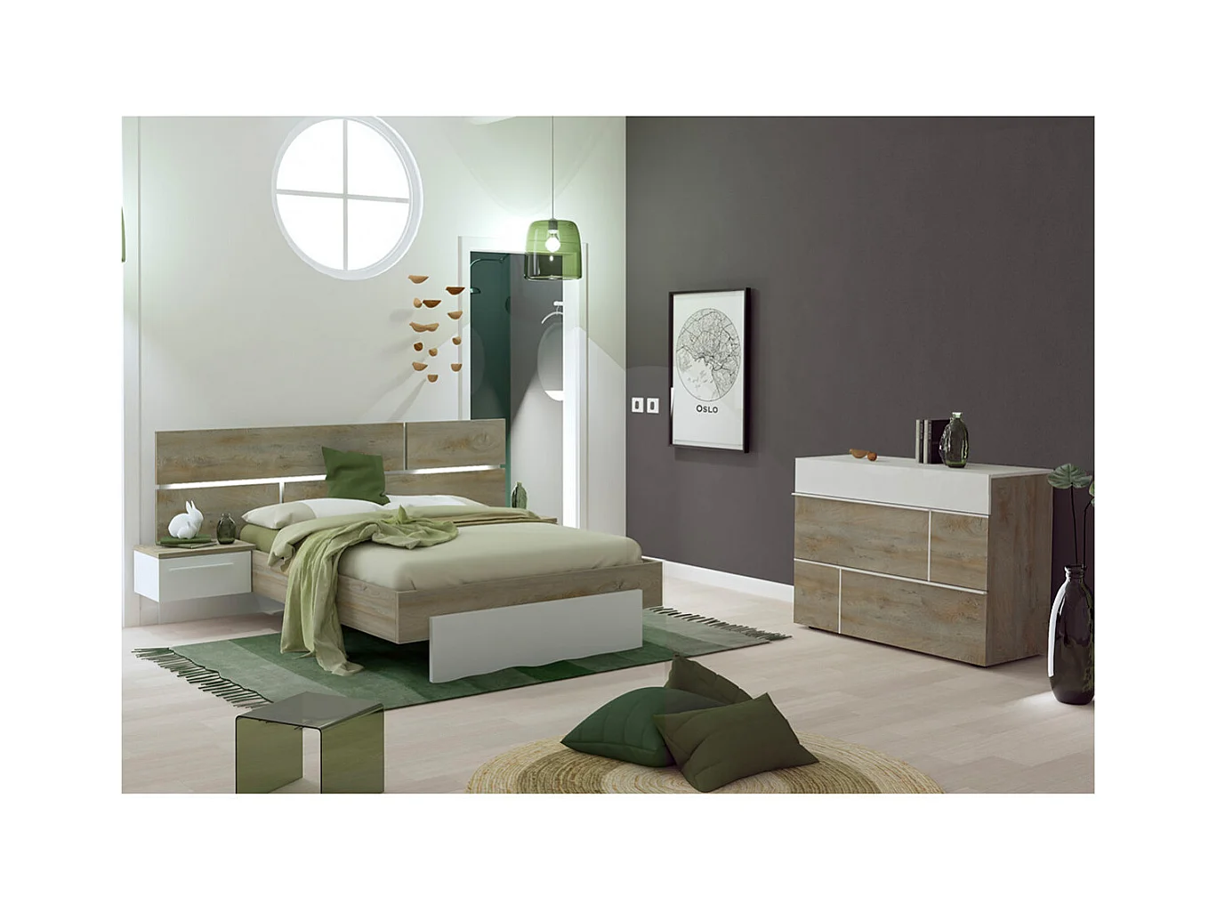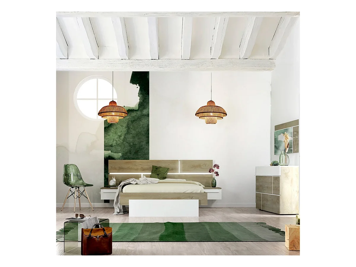 NINO LIGHT - Lit 140x190cm avec Leds et Chevets Suspendus + Commode