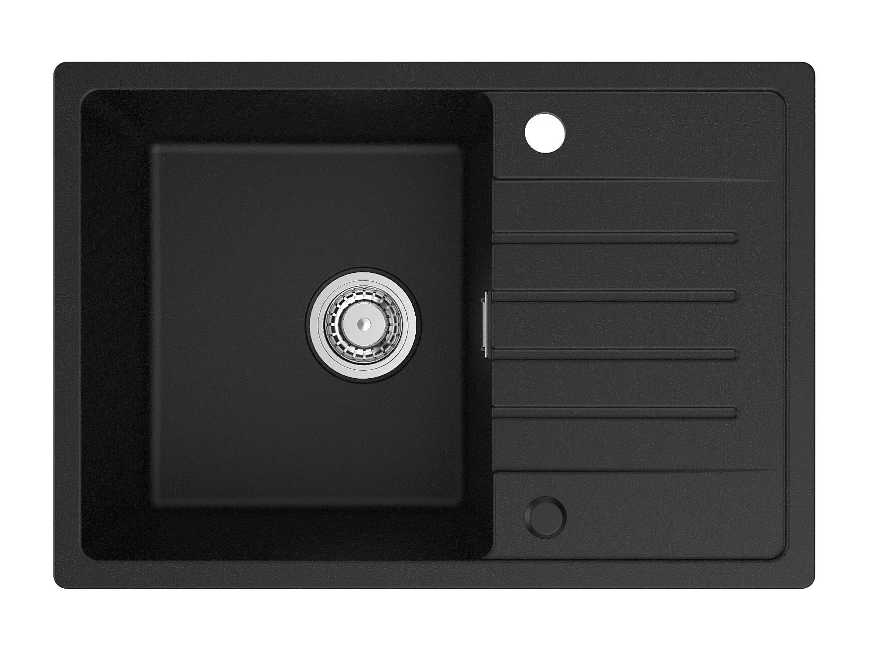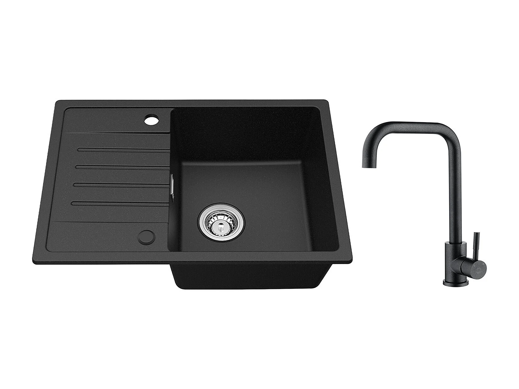 Noir Evier à Encastrer 1 Bac avec Egouttoir, Quartz et Résine, 65x45cm + Mitigeur de Cuisine en Inox Noir étoilé avec Bec Haut et Incurvé