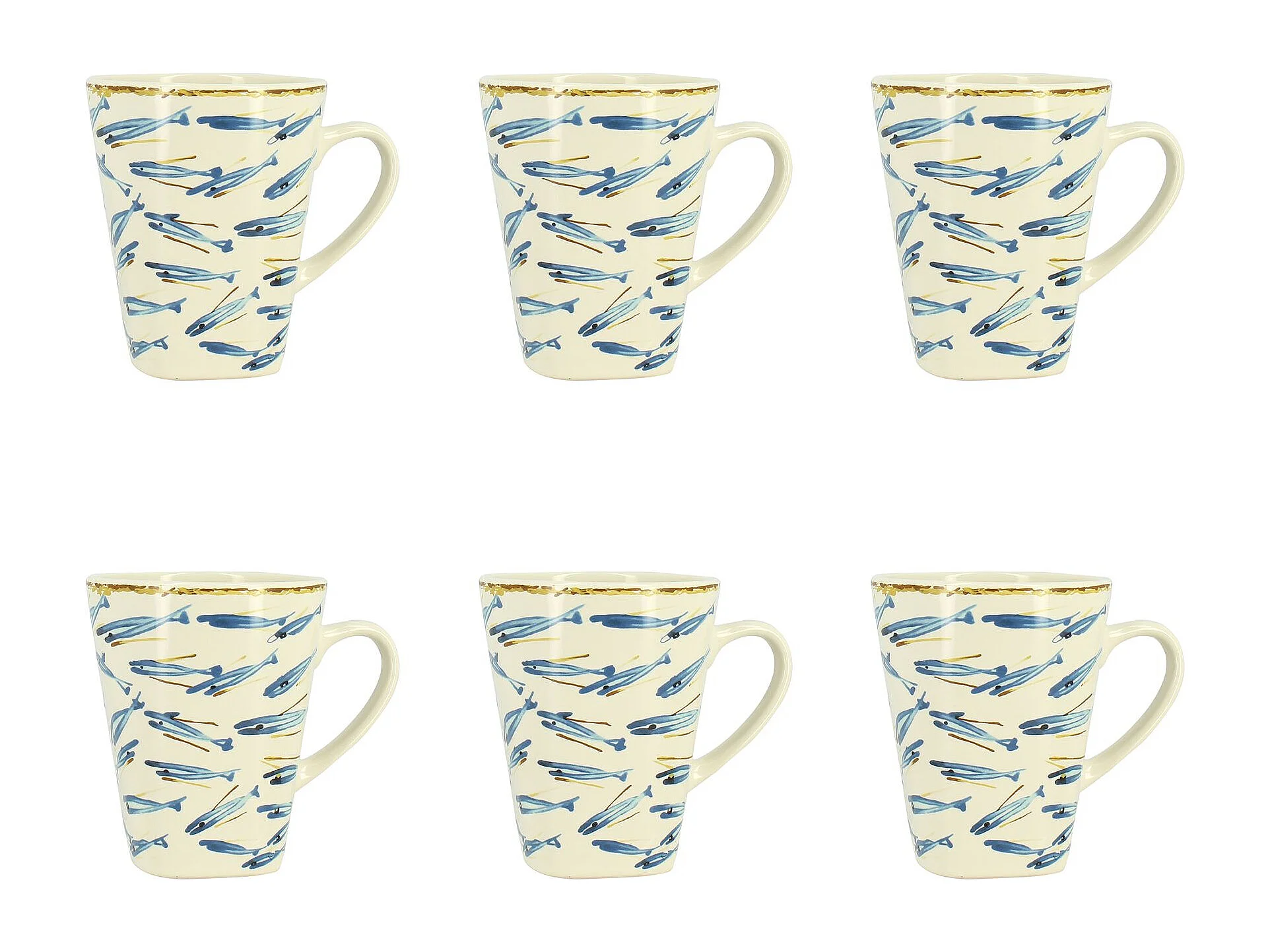 Novastyl - Lot 6 Mugs Corfu 38cl En Gres Blanc Avec Des Rayures Bleues