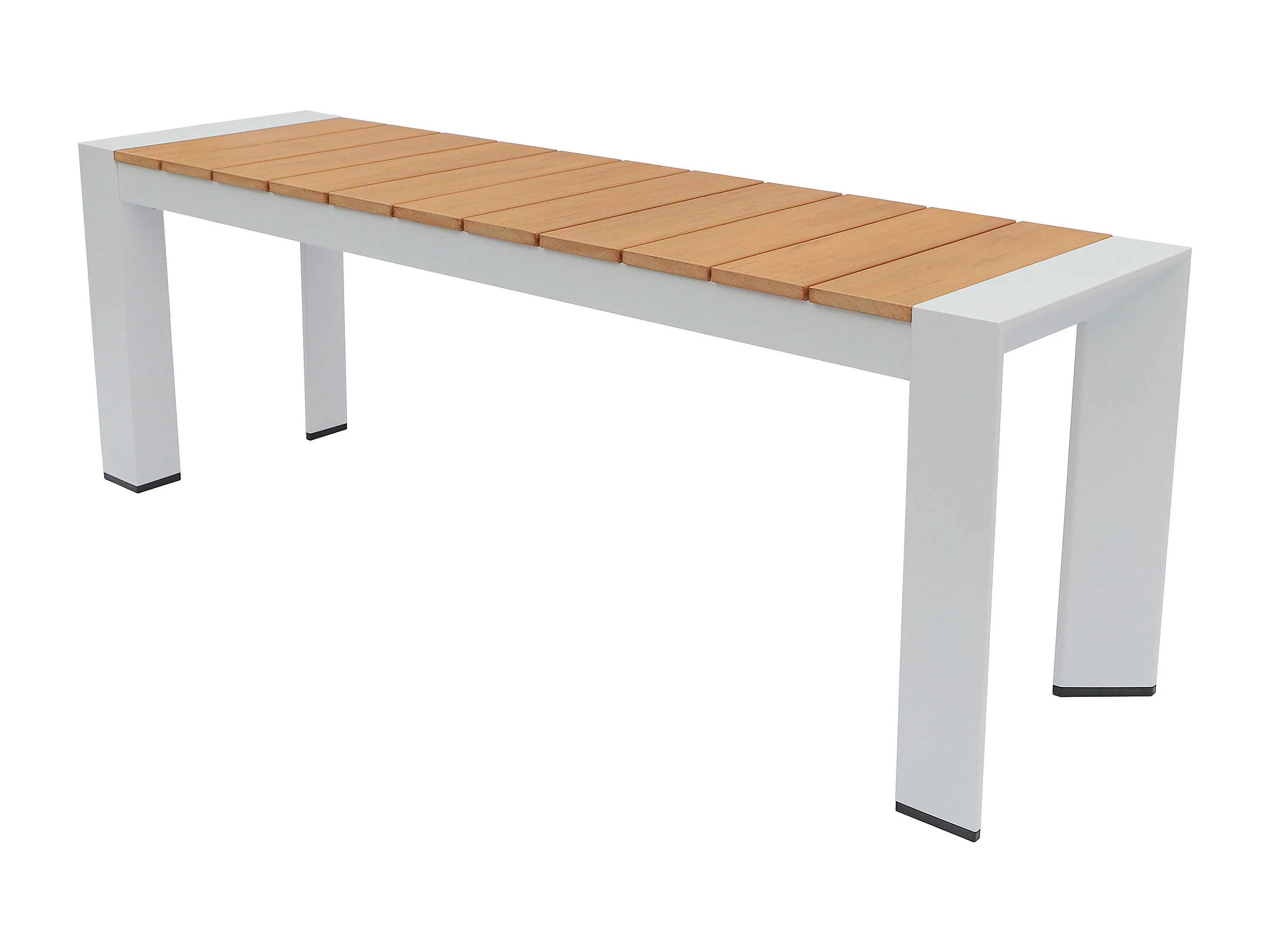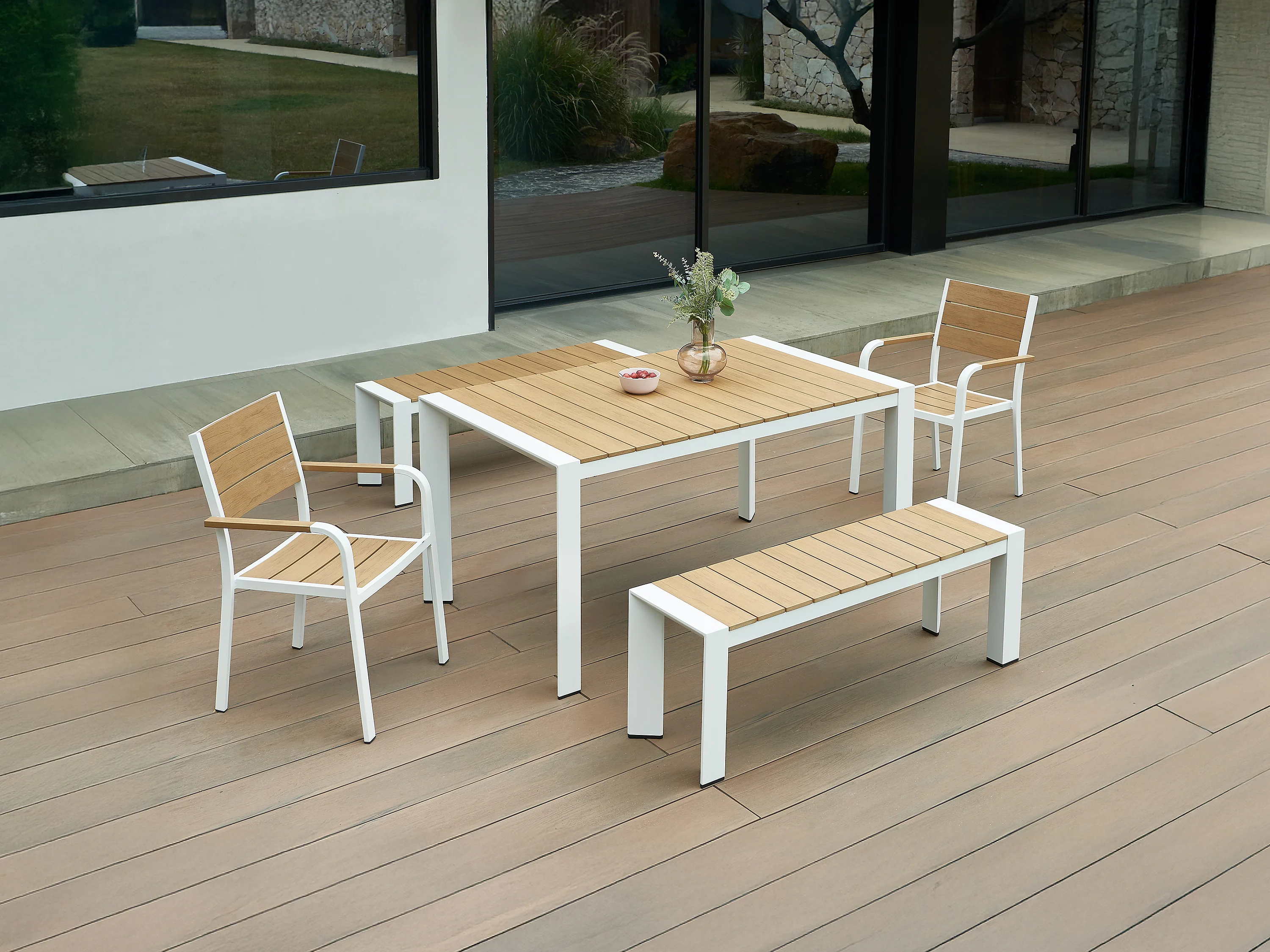 Salle à manger de jardin en aluminium : une table L.150 cm, 2 fauteuils et 2 bancs - Naturel clair et blanc - NYROS de MYLIA