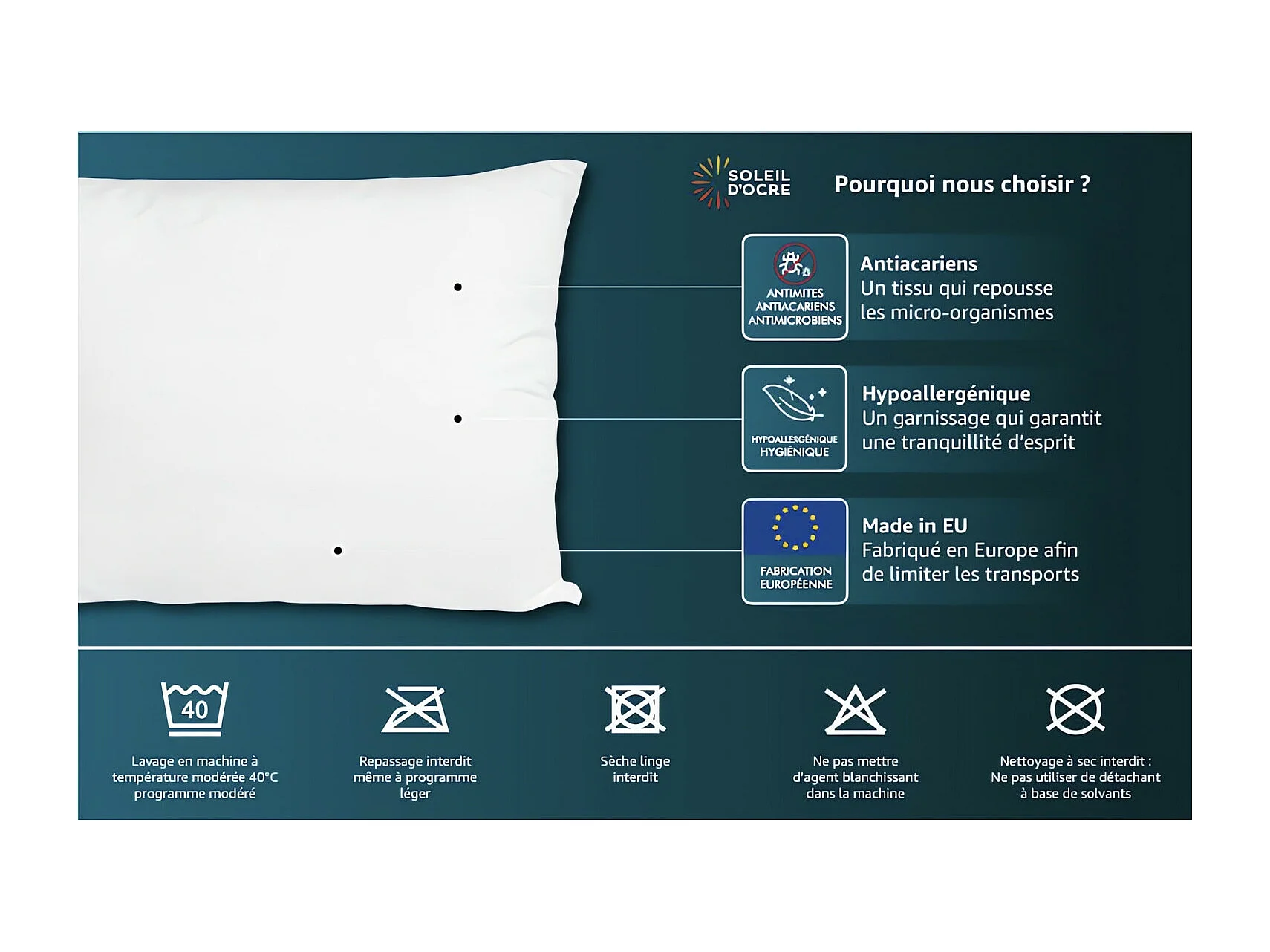 Oreiller anti-acarien LUXE 60x60 cm, par Soleil d'ocre