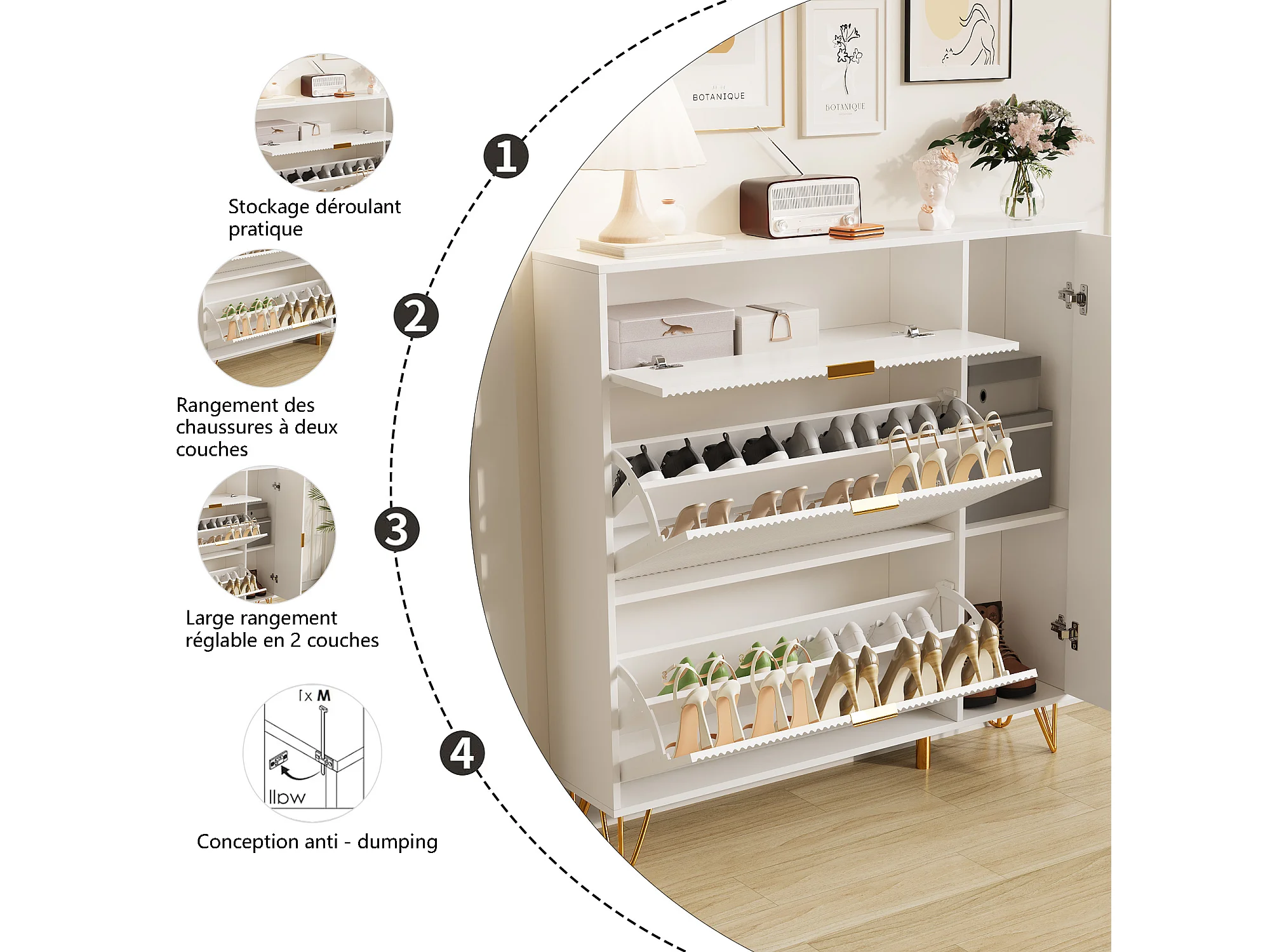 Organisateur de cabinet de chaussures indépendant avec 3 tiroirs pliants et 2 compartiments de rangement, casier à chaussures pour couloir du salon