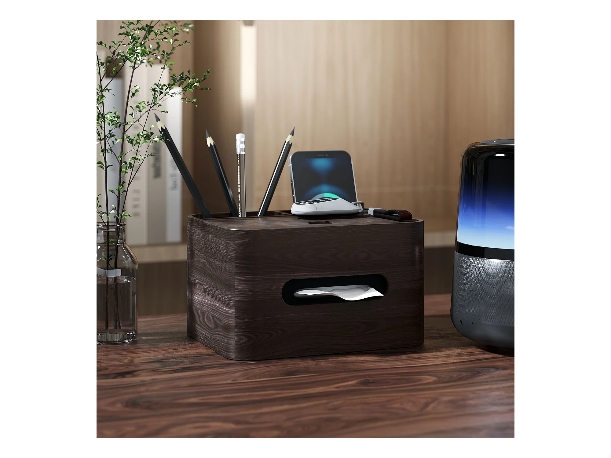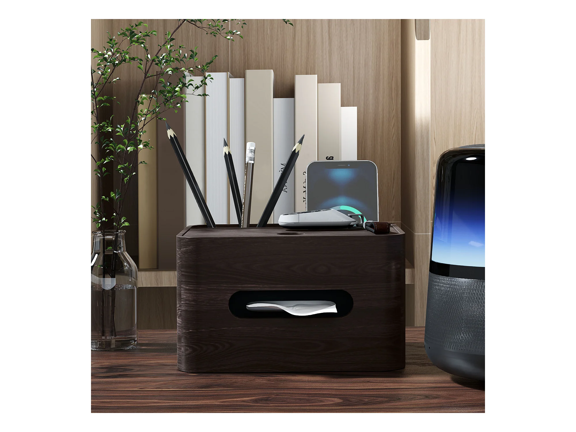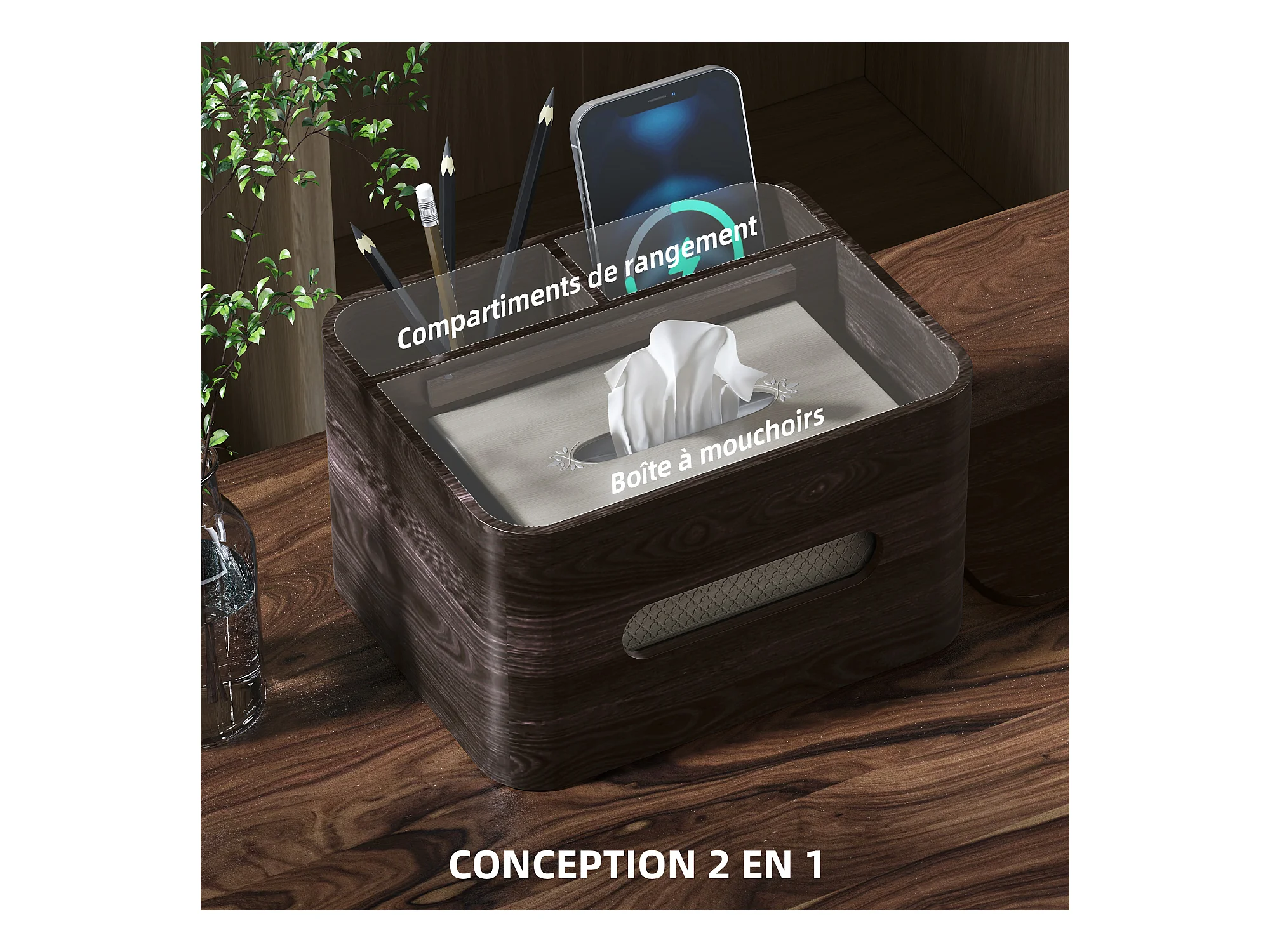 Organiseur de bureau rangement bureau - 2 compartiments, boîte à mouchoirs - aspect bois foncé
