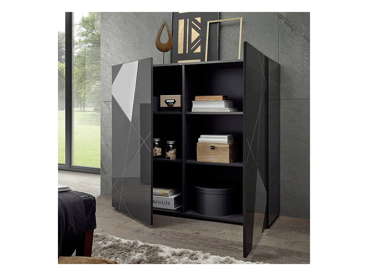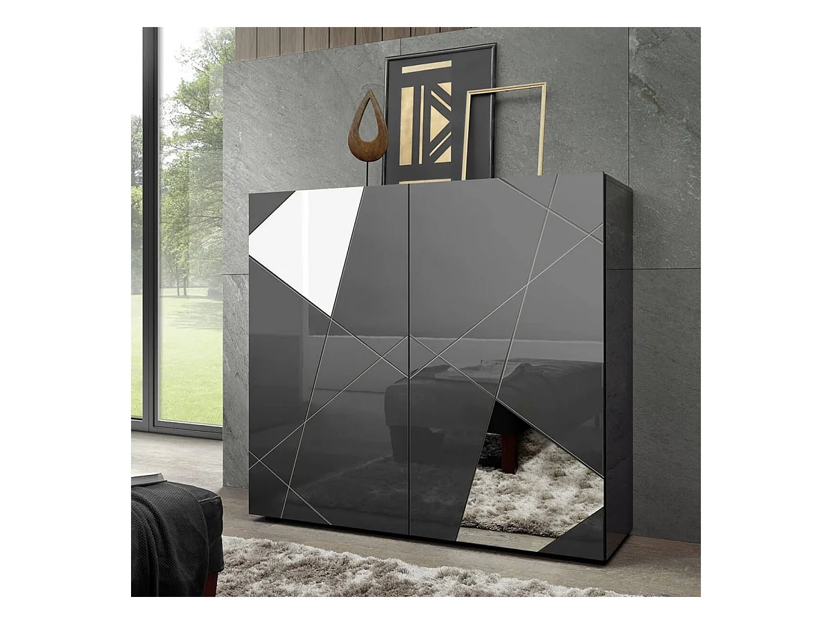 ORIANA - Rangement 2 Portes Finition Gris Carbone avec Sérigraphies et Miroirs
