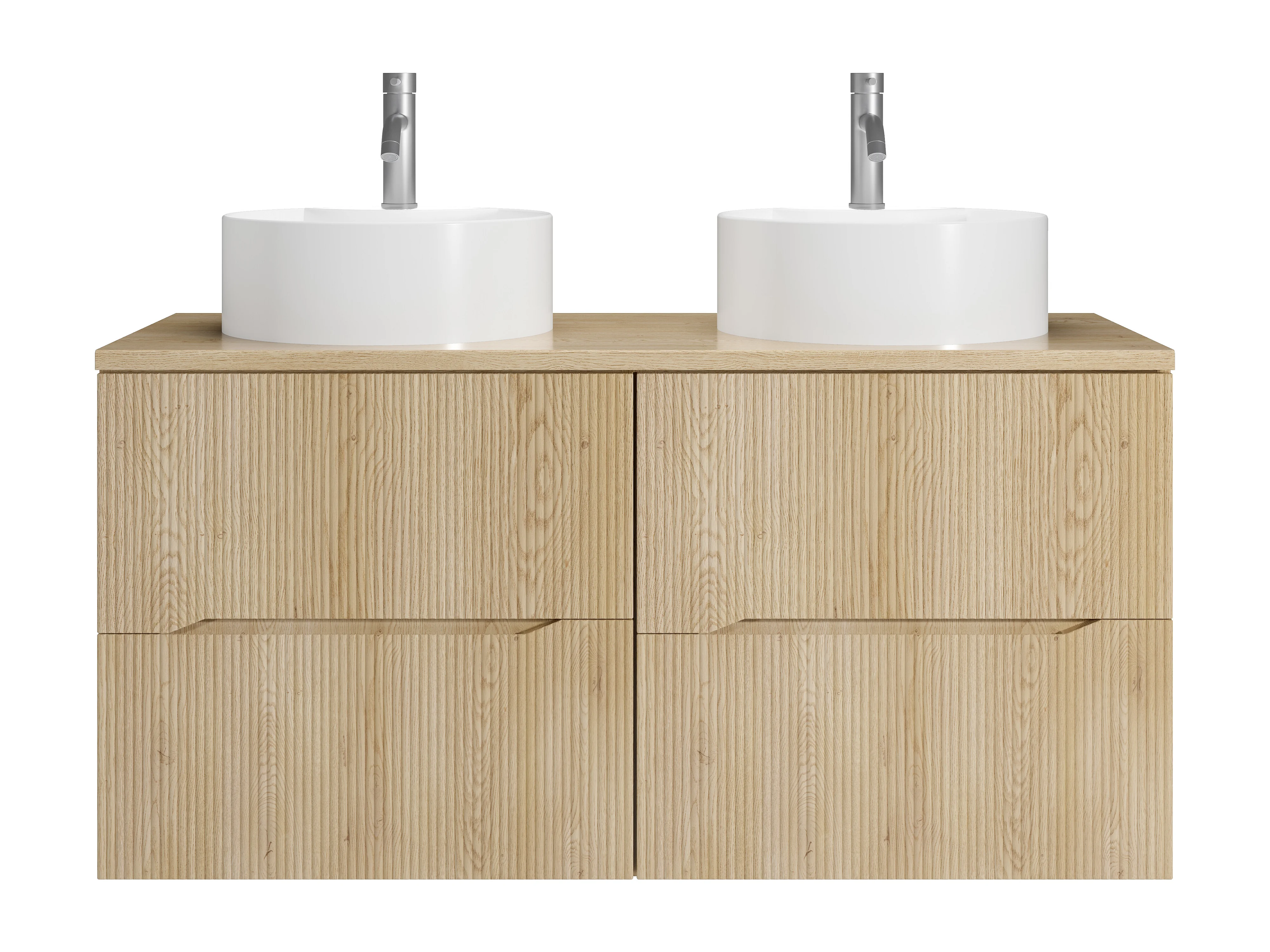 Meuble de salle de bain suspendu strié avec vasque à poser ronde et robinet - Naturel clair - 120 cm - ORISO