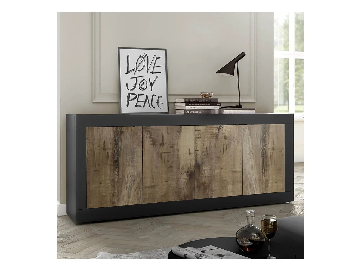 OTELLO - Buffet 4 Portes Finition Noir Mat et Aspect Bois Antik