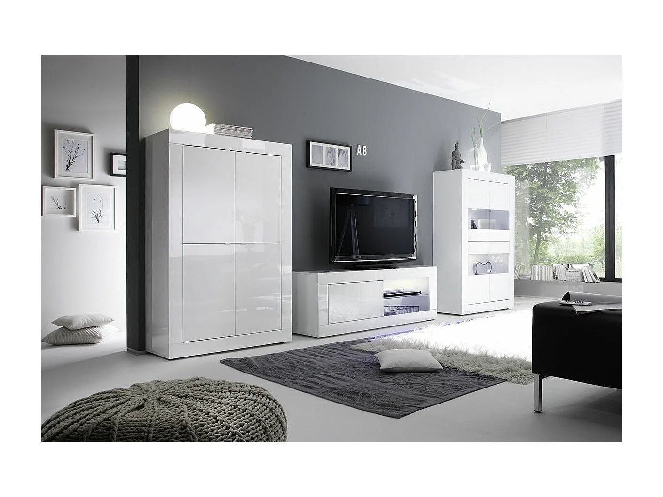 OTELLO - Ensemble Salon avec Vitrine 4 Portes Finition Blanc Laqué Weiss avec Leds