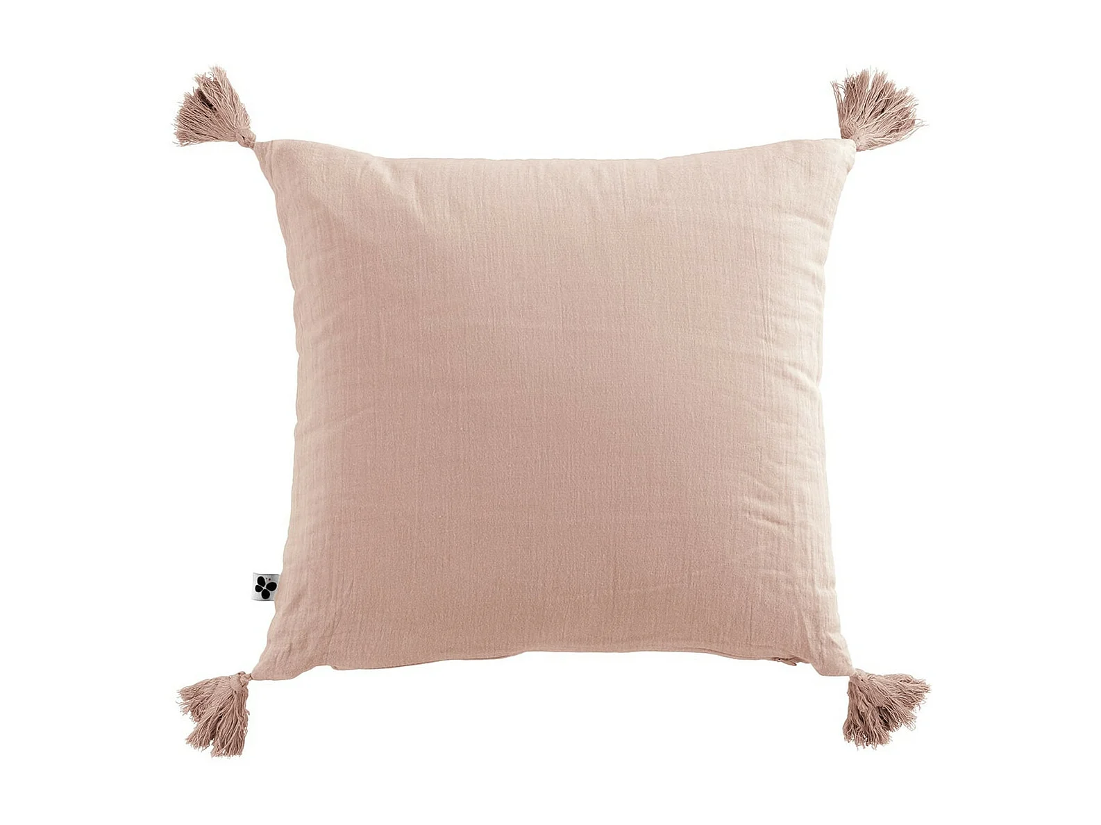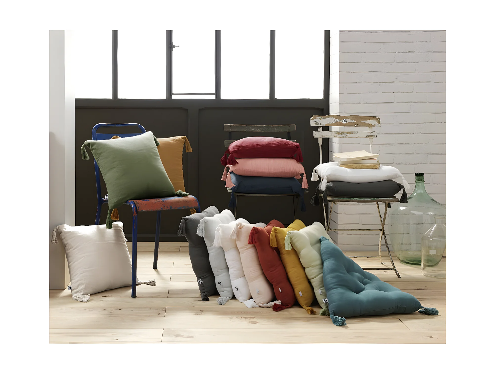 OUREA - Coussin Déhoussable 40x40cm avec Pompons Gaze de Coton Guimauve