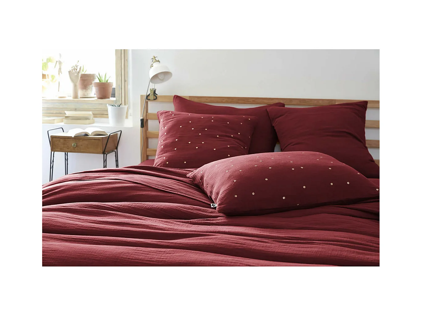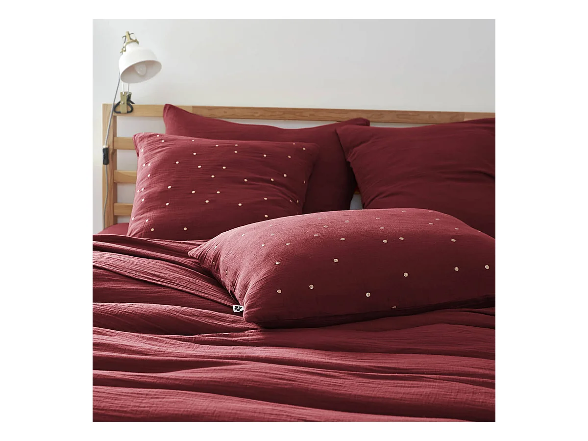 Taie d'oreiller à pois brodés double gaze de coton bordeaux 60x60 cm