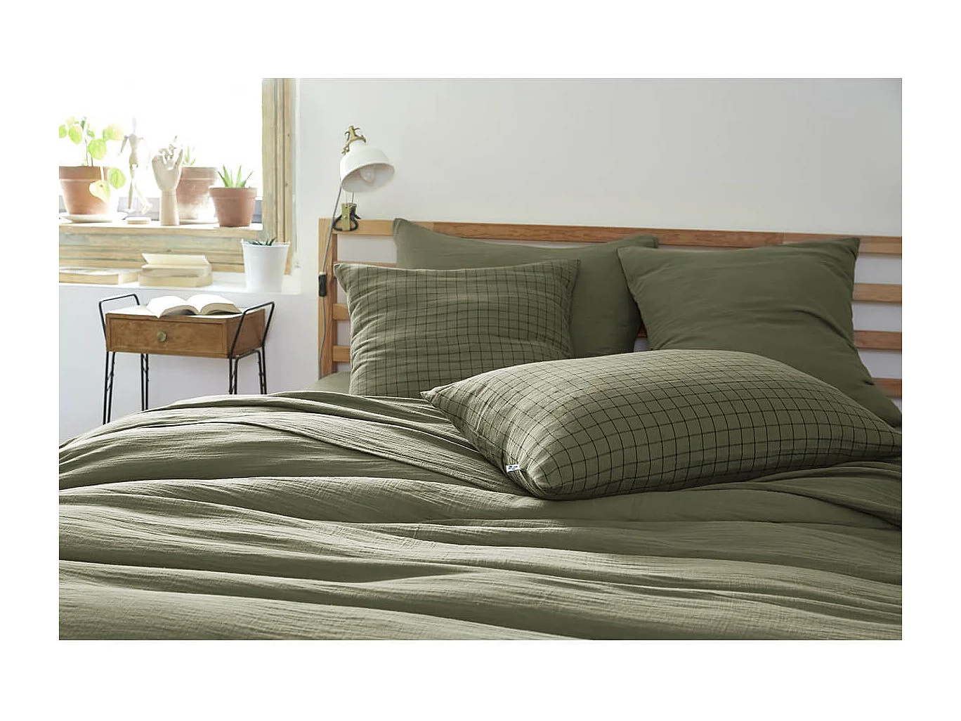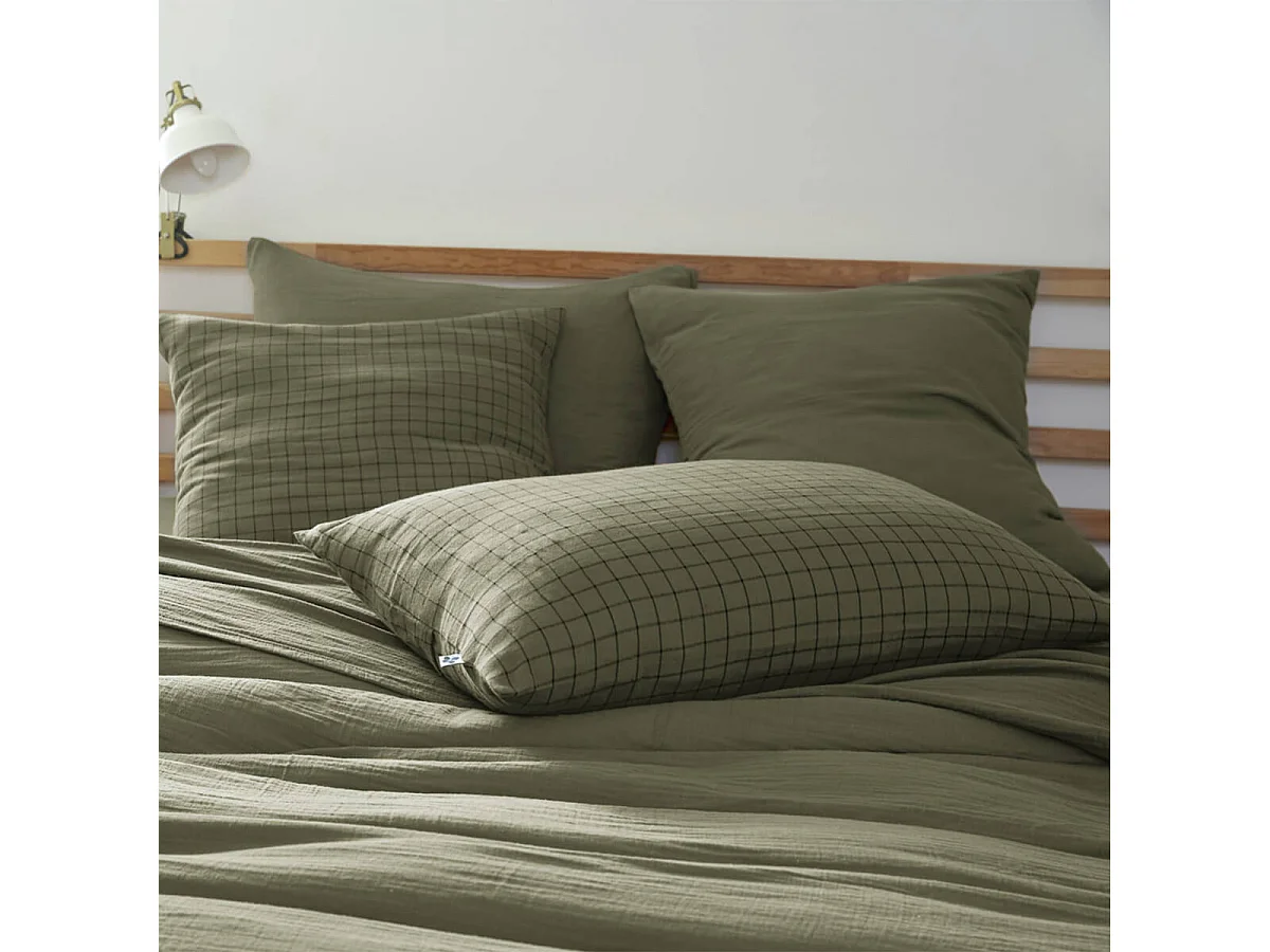 Taie d'oreiller à carreaux double gaze de coton kaki 50x70