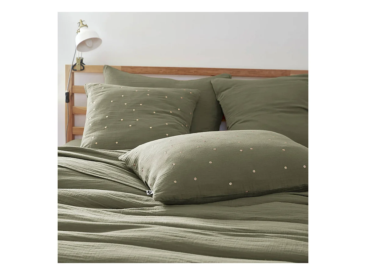 Taie d'oreiller à pois brodés double gaze de coton kaki 50x70 cm