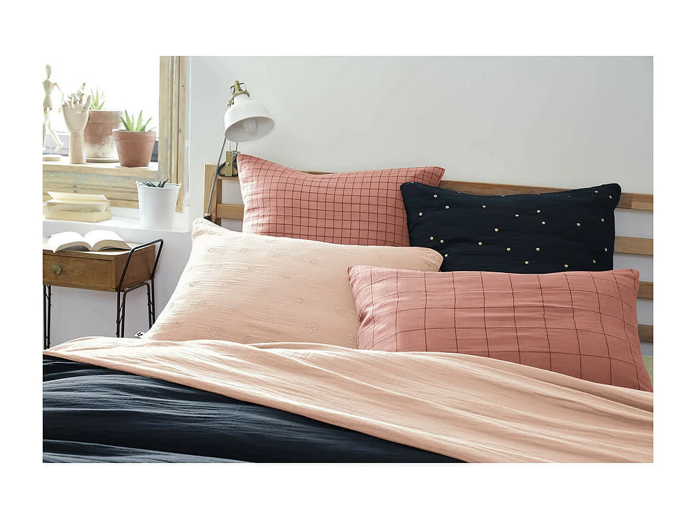 Taie d'oreiller 60x60 double gaze de coton grands carreaux rose pêche Terre de Nuit